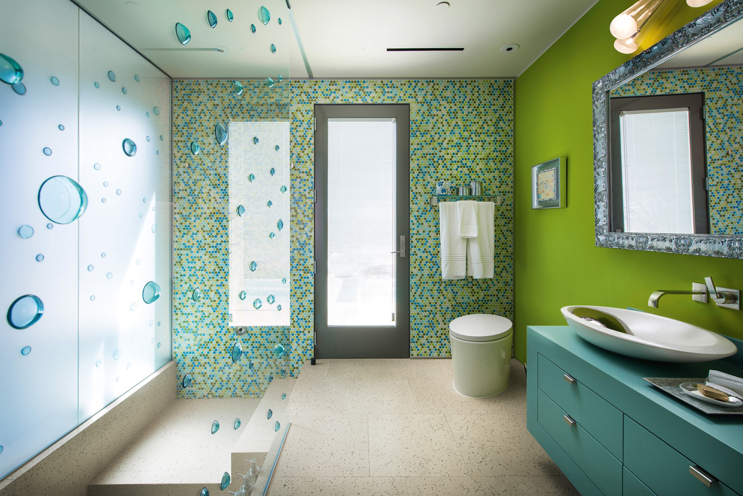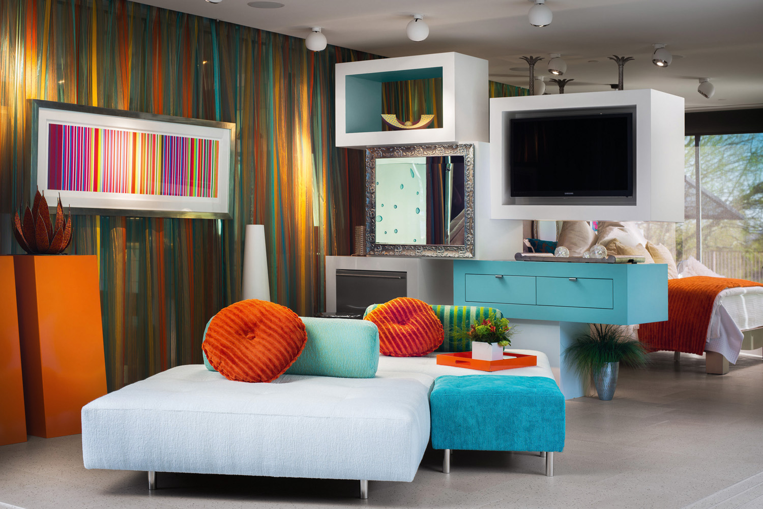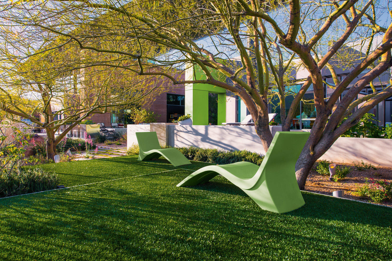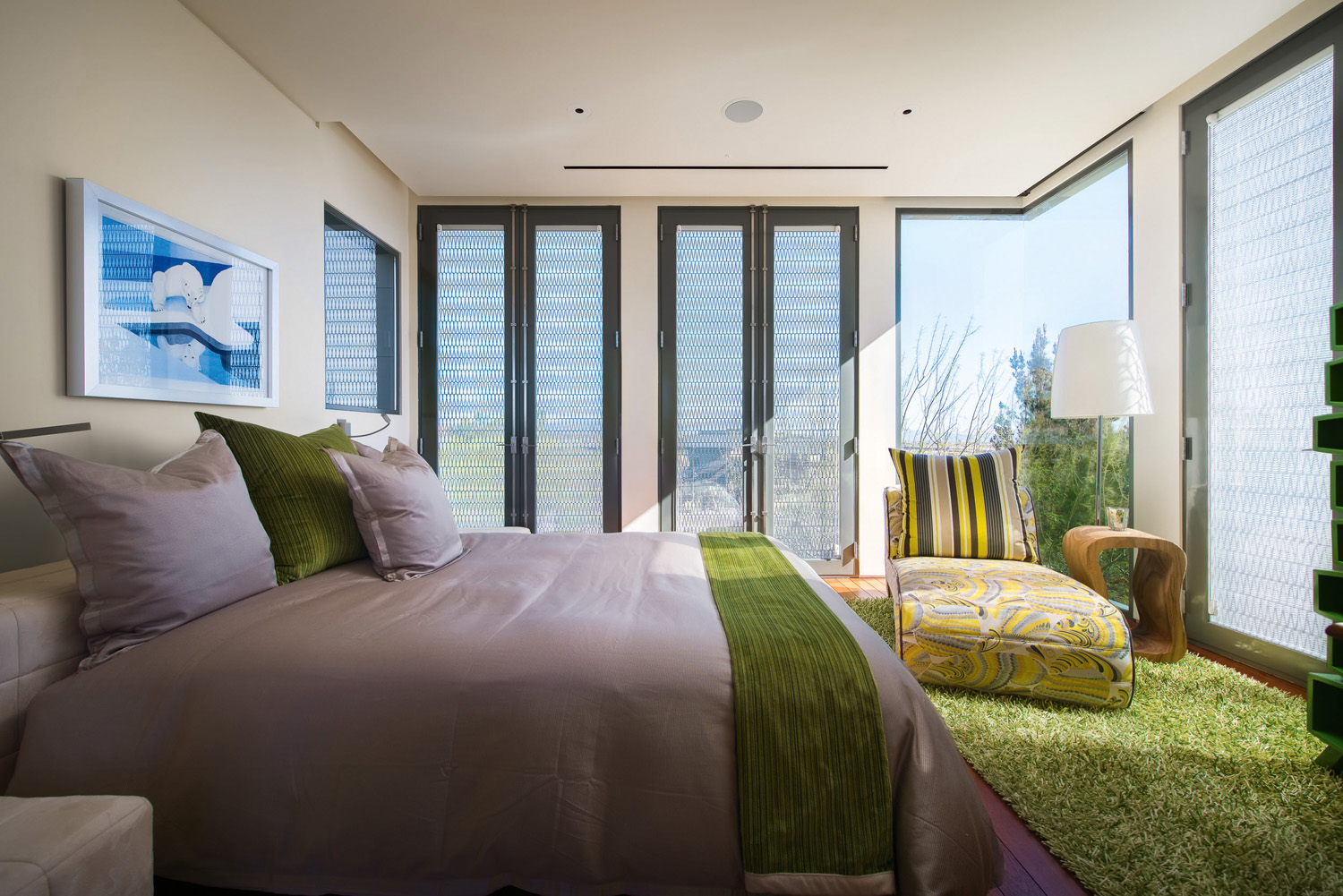 Shining the spotlight on the surrounding desert environment was important for John and Jonathan, but sustainability was also a prime consideration and had to be incorporated into the design in a big way — classic Vegas style. “We sought to employ elements of eco-friendly and climate-appropriate design throughout our home,” says John. The nine-bedroom property is surrounded by a one-of-a-kind 24-foot-high rammed-earth wall that is the first of its kind in Vegas and was created using traditional adobe construction methods. Electricity is also taken care of with a 10-kilovolt photovoltaic system harnessing the sun’s energy to offset one-third of the home’s electricity needs.