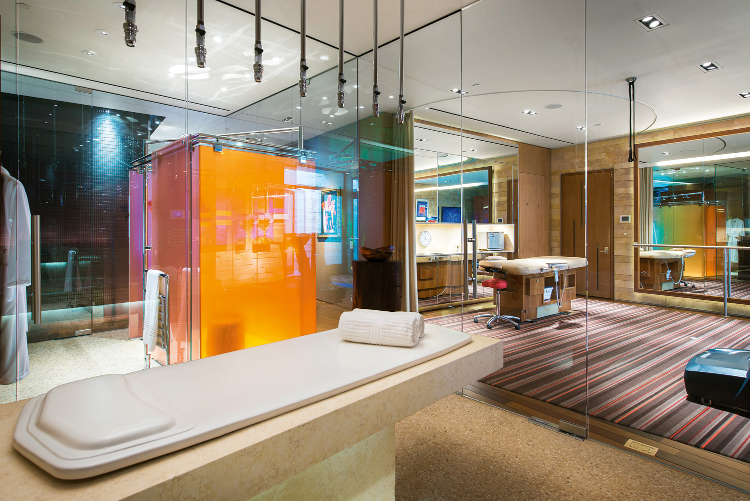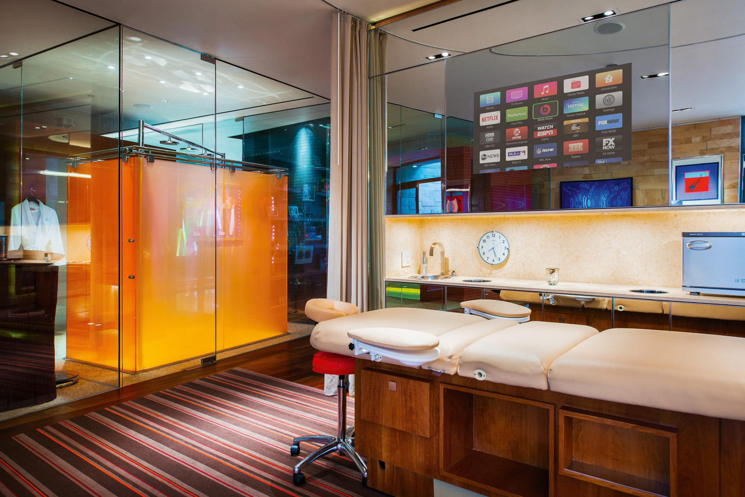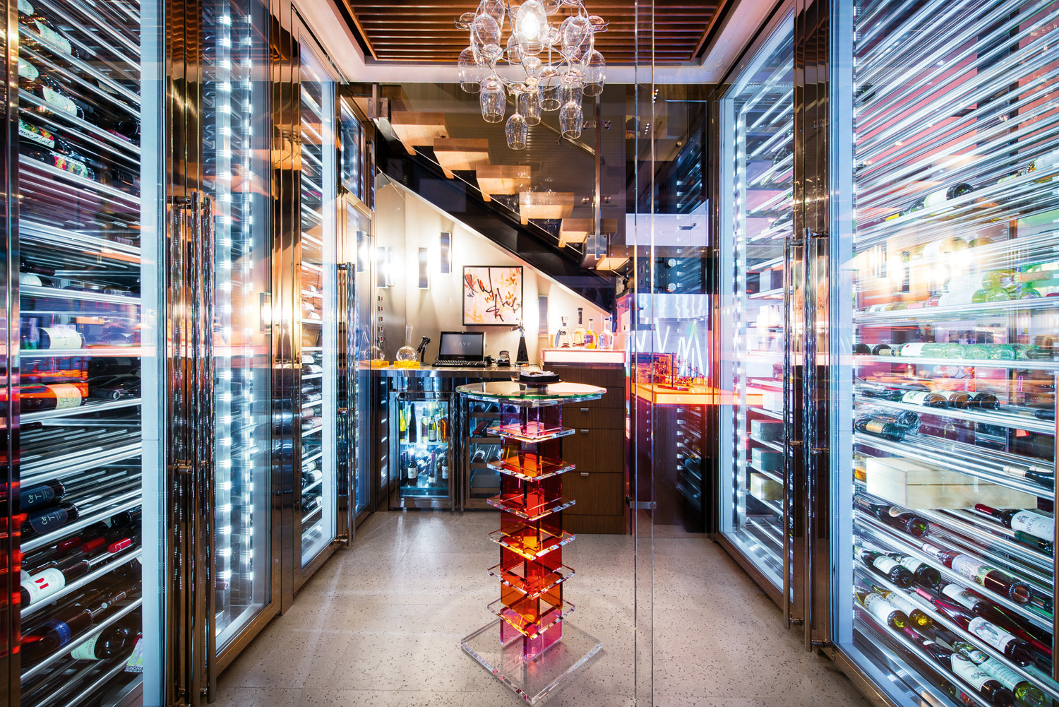 And why would you? The main floor features an Italian custom-designed kitchen that flows to an outdoor entertainment area decked out with designated seating areas and a zero-edge pool and spa. But the real fun begins on the play level, as the name suggests. To access the fun, all you need to do is press the play button in the home’s hidden elevator which whisks you straight down to a waiting cocktail bar, two cosmic bowling alleys and a private movie theatre — not to forget the Vichy spa and 1800-bottle-plus wine cellar. “We wanted a space that housed all the amenities a Las Vegas entertainment professional would want without betraying any of the inner workings of the home,” says John.