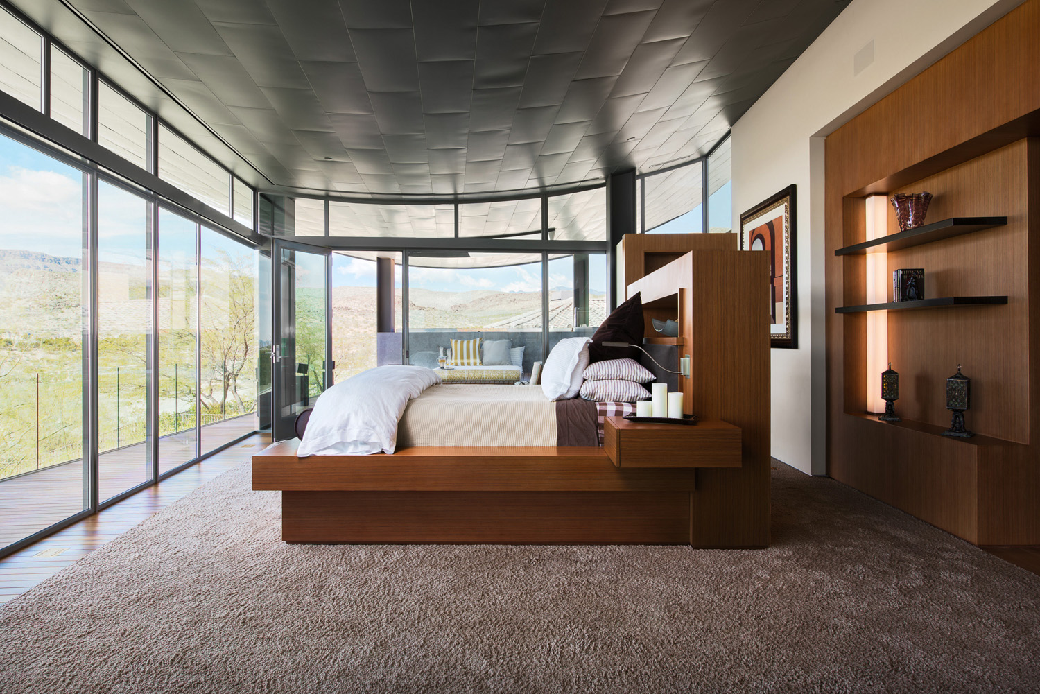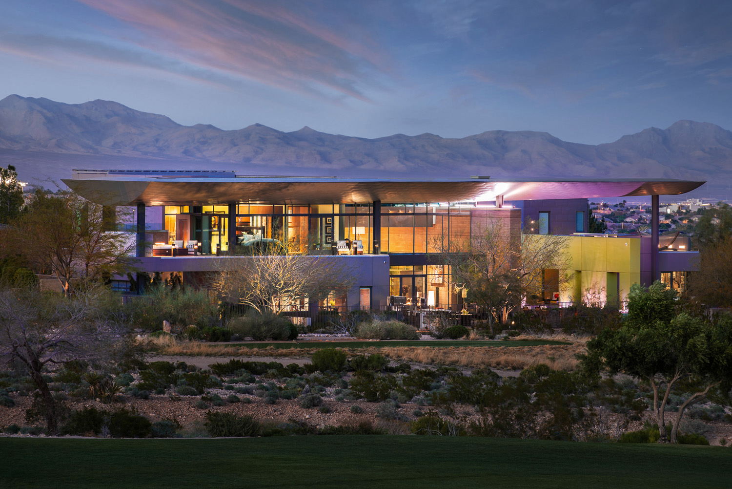 Structurally, the home is contemporary, forward-thinking and modern for a residence that contains such amenities. A 140-foot wing-like structure covered in zinc serves as the ceiling for the master bedroom. “We wanted this home to be a living work of art,” says John. “True, the home’s roofline is definitely not your traditional Vegas stucco, especially when set among the rolling Nevada hills and desert skyline, yet colour and material choices help it appear as if it’s part of the natural landscape. It’s a study in contrasts — harmonious yet bold.”