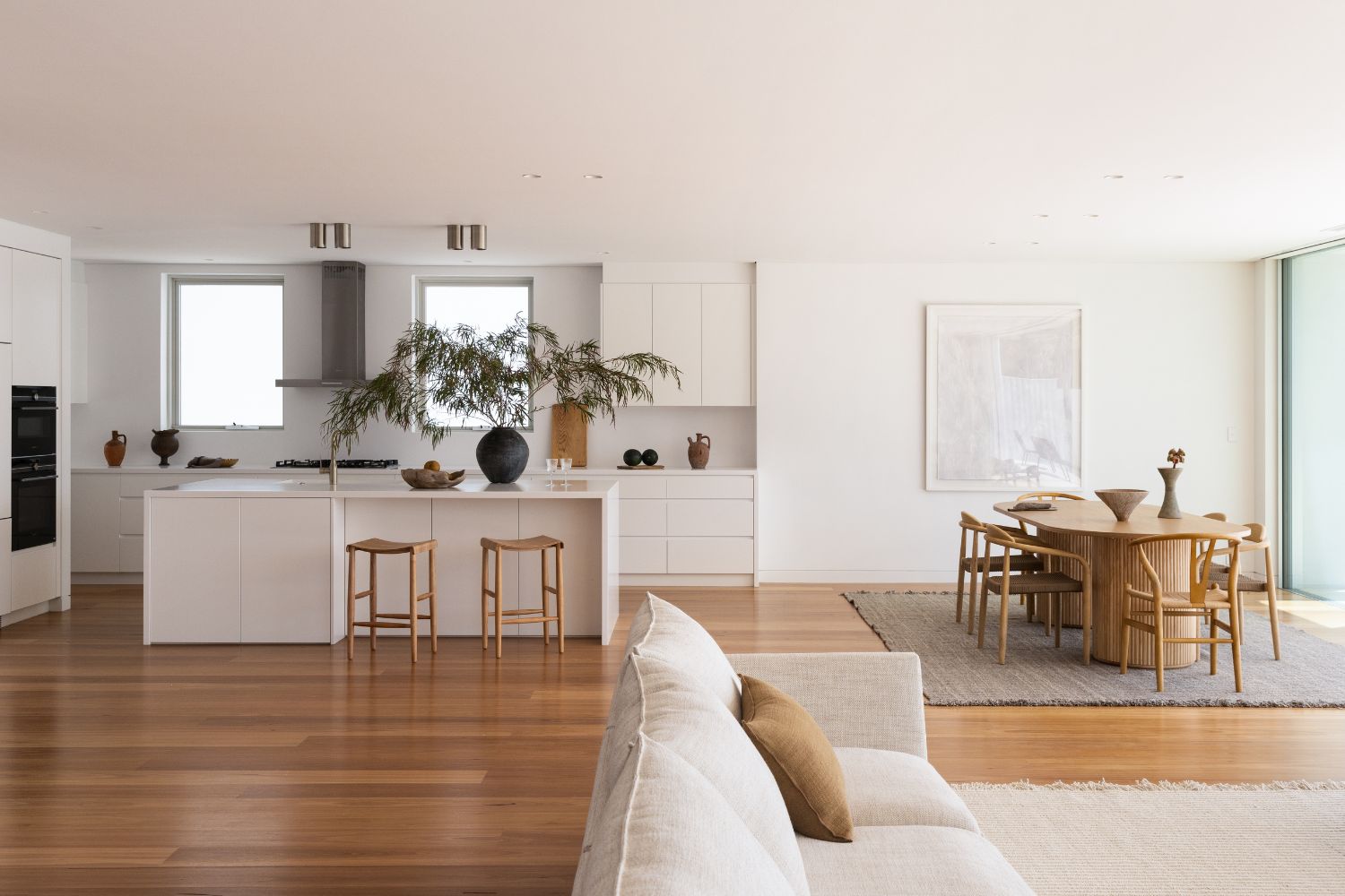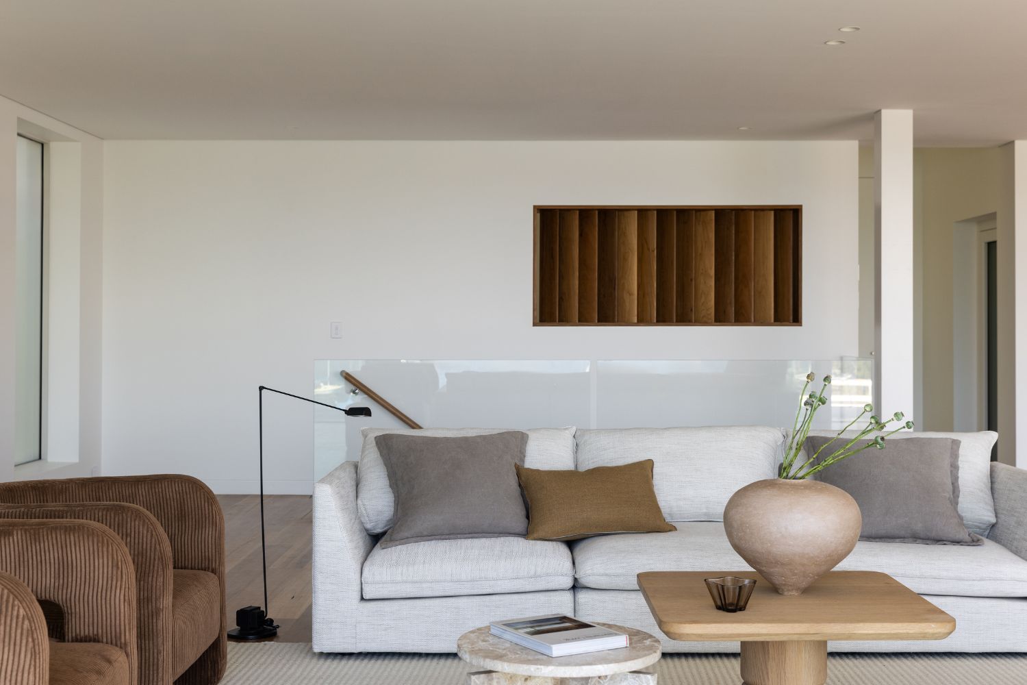 Several key features make Serenity House truly shine. To create the statement entrance, a custom western red cedar battened pivot door with book-matched curved style was chosen. The sitting room’s cathedral ceiling is a striking design element, appearing as the home’s centrepiece despite being offset, achieved through an in-house-designed false ceiling for perfect symmetry.