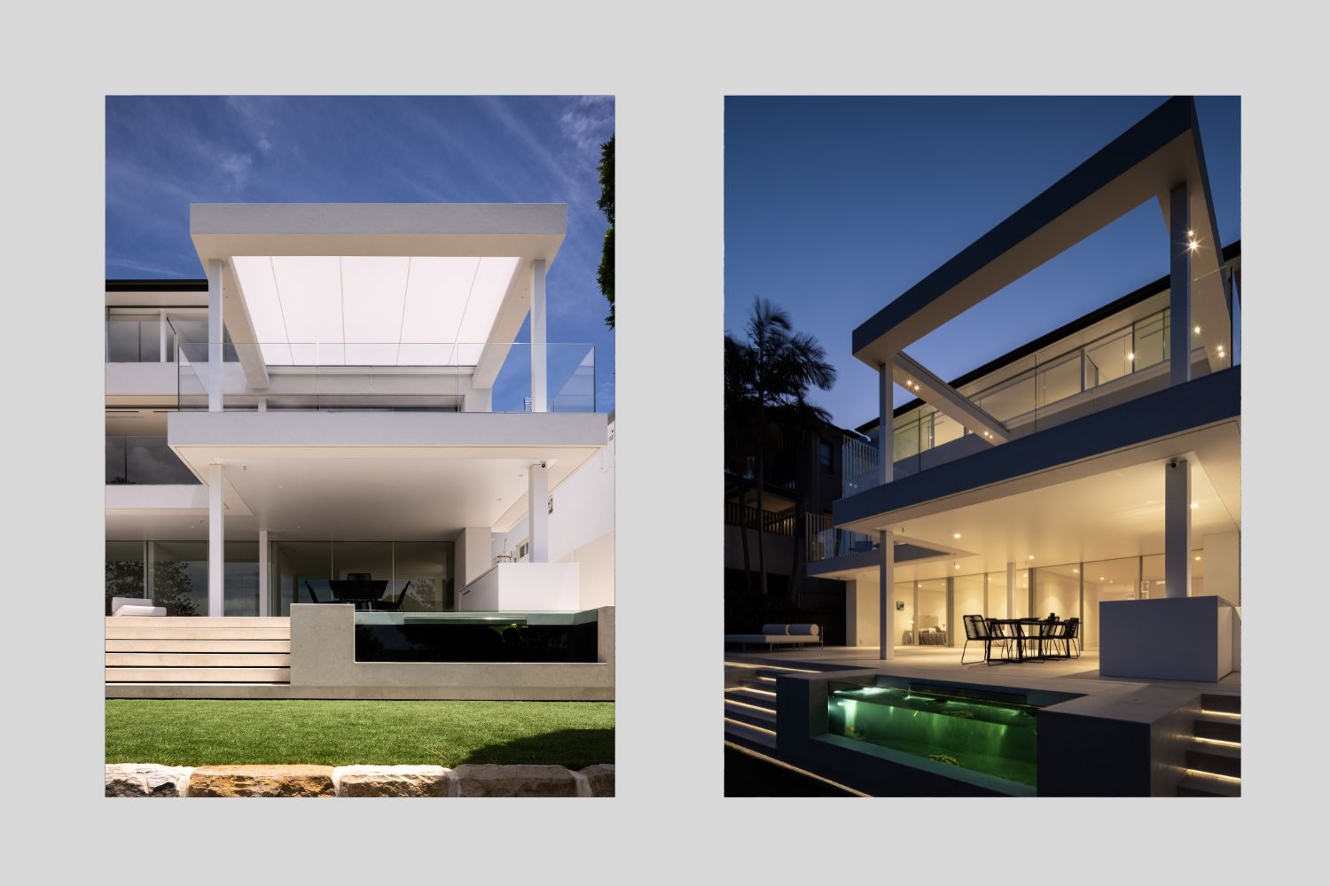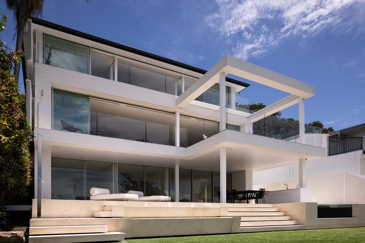 High-end finishes include Vitrosca sliding doors across all three levels, frameless glass balustrading with concealed fixings, a pergola with a hidden awning track, full-height frameless doors with concealed hinges, solid strip timber flooring, and book-matched 1200x600mm tiles to bathrooms. These elements all showcase the high level of craftsmanship involved to create the home.