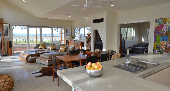 The three-bedroom residence has an office, two bathrooms and two living areas offering a bucolic outlook of the property and Lake Cooper. “As this was a large rural block with north-facing views over the bush, it was a terrific opportunity to build massive windows on the north and achieve over 8-star energy efficiency,” says Peter. One of the special considerations for the design of the home was maximising solar access in winter to the living spaces and kitchen. Beautiful polished concrete flooring in the living area, together with an interior brick wall, provides thermal mass that stores heat absorbed from the sun during winter days, and releases it to warm the home each evening.