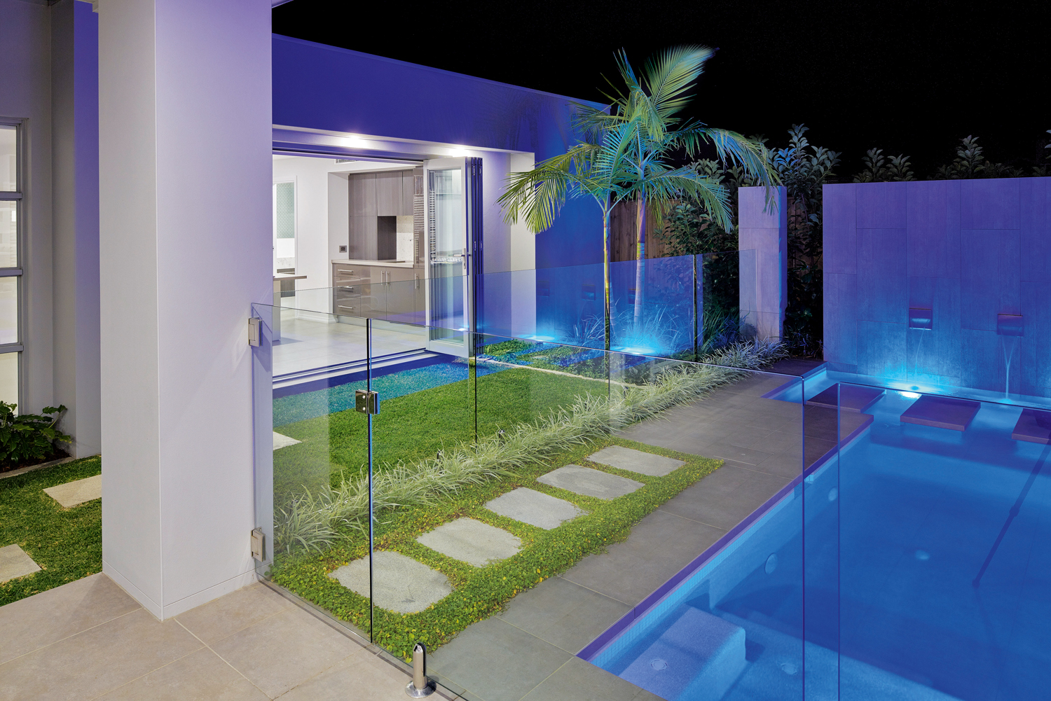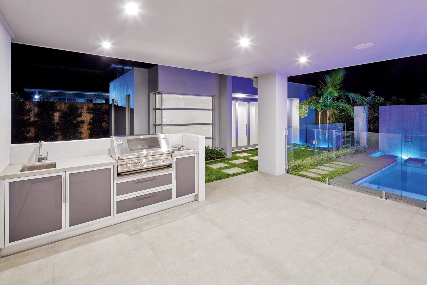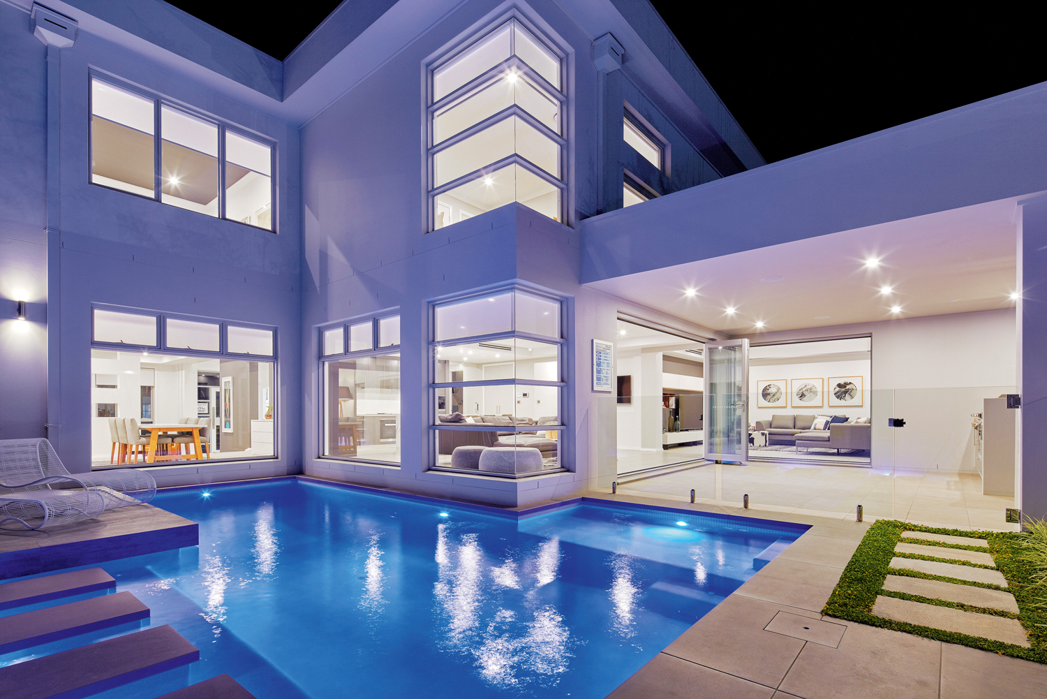 “The Platinum has a distinctly resort-like finish to it with its swimming pool complete with sunken aqua seats, undercover alfresco dining area and elegant formal entertaining and dining space. This display home also features a freestanding poolside pavilion — complete with its own bathroom and kitchenette/wet bar that can also double as an office, games, guest space or teenage retreat. As with any custom build, homeowners can choose which luxury features work perfectly for them, and can leave out those that don’t.