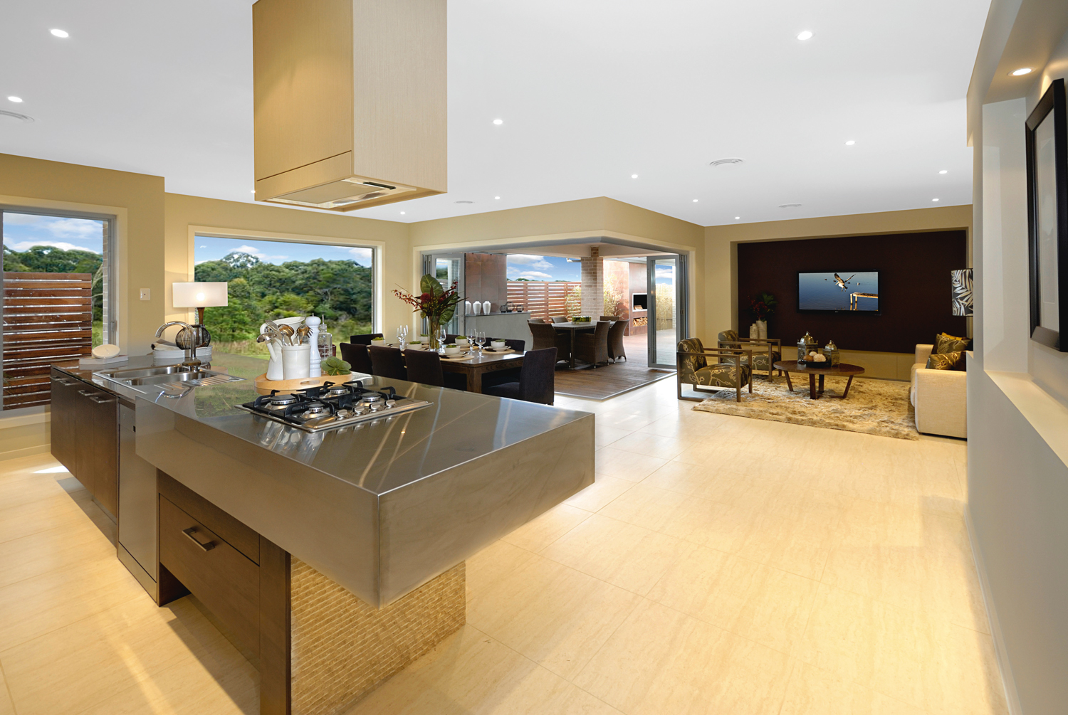 Supervising the kids while cooking is also made easy as the kitchen overlooks the dining and family rooms. This area also flows out to the optional alfresco space via glass bi-fold doors, as well as a sunken home theatre/playroom for the children.