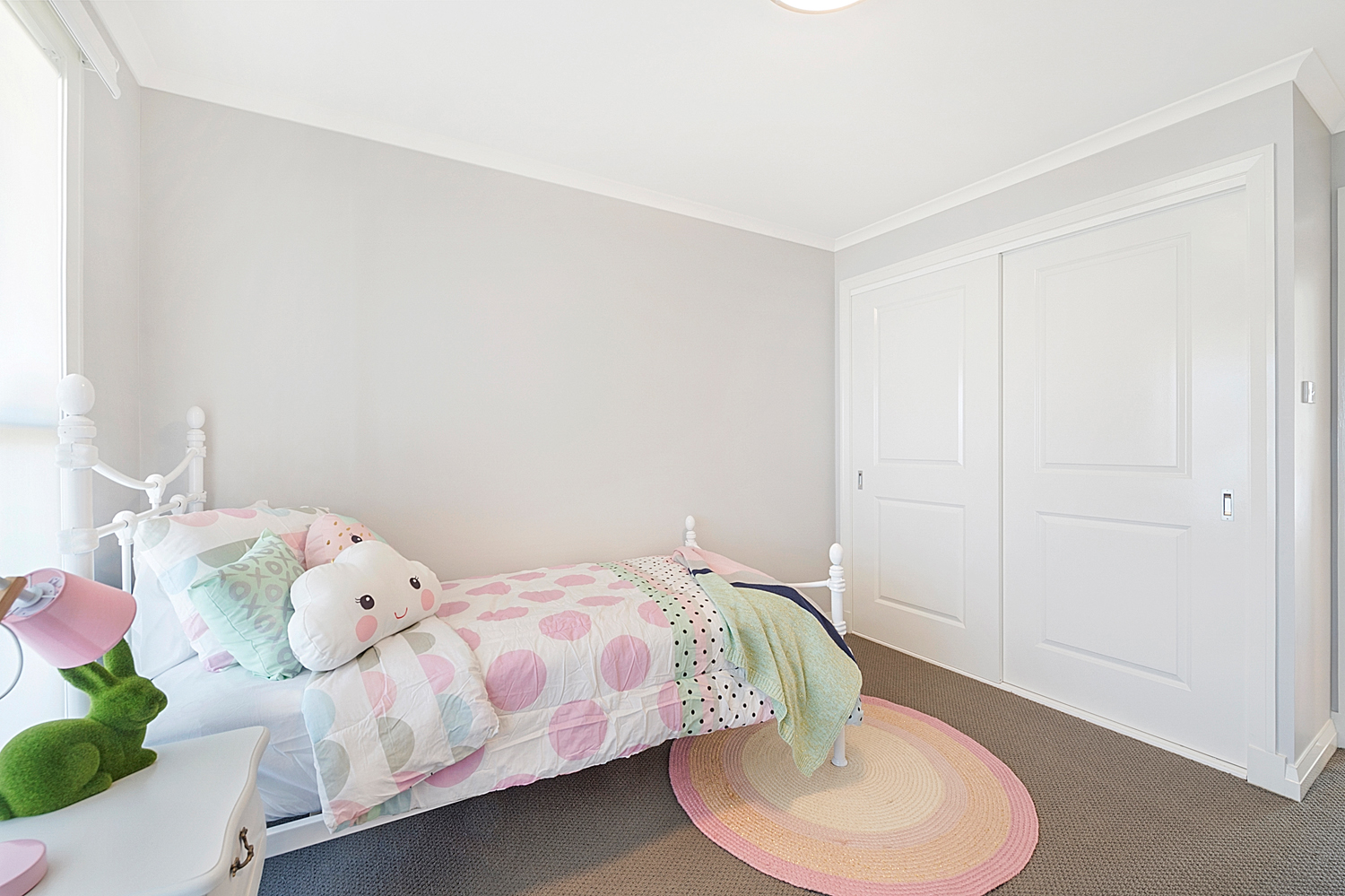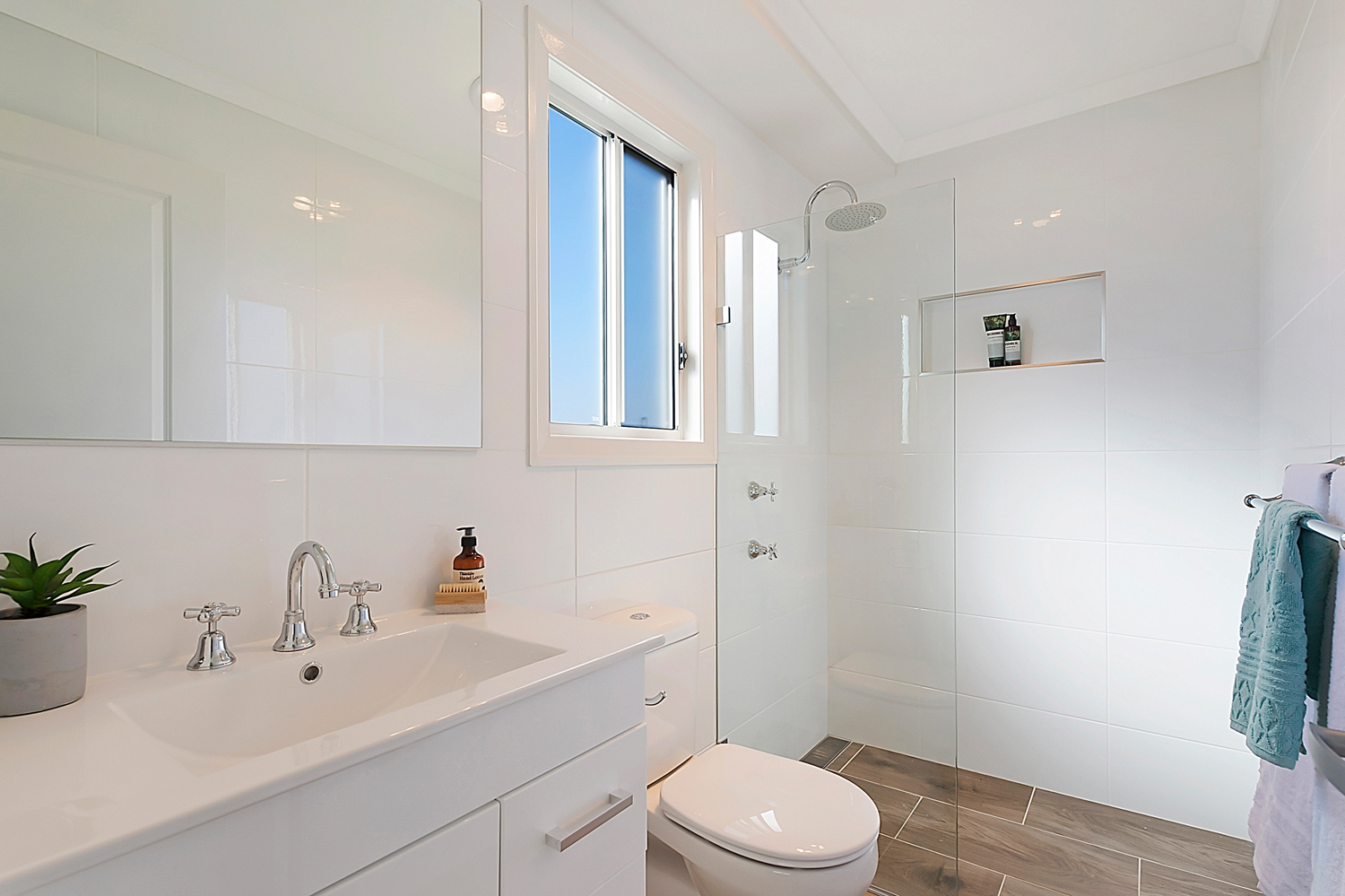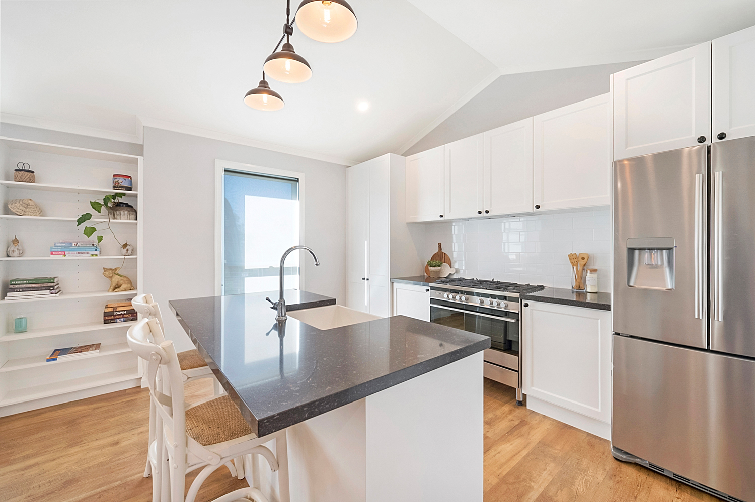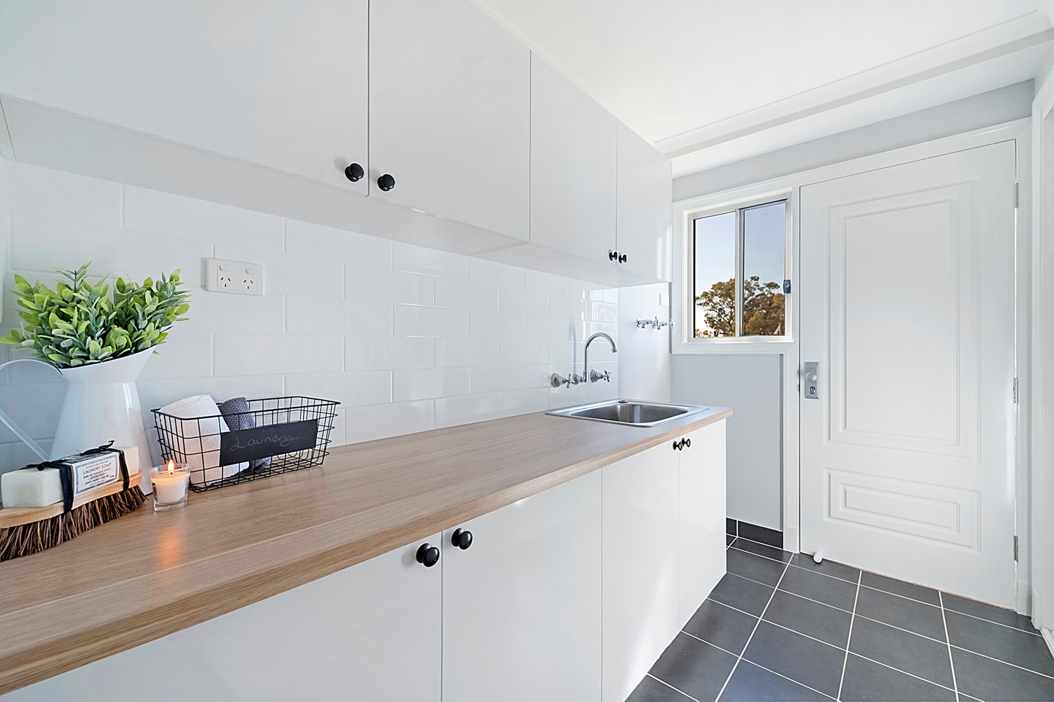 ‘Uberflor’ Vinyl plank flooring, selected for its practical, hardwearing properties, connects neutral colour tones from the living area to the 3 bedrooms via the widened hallway.