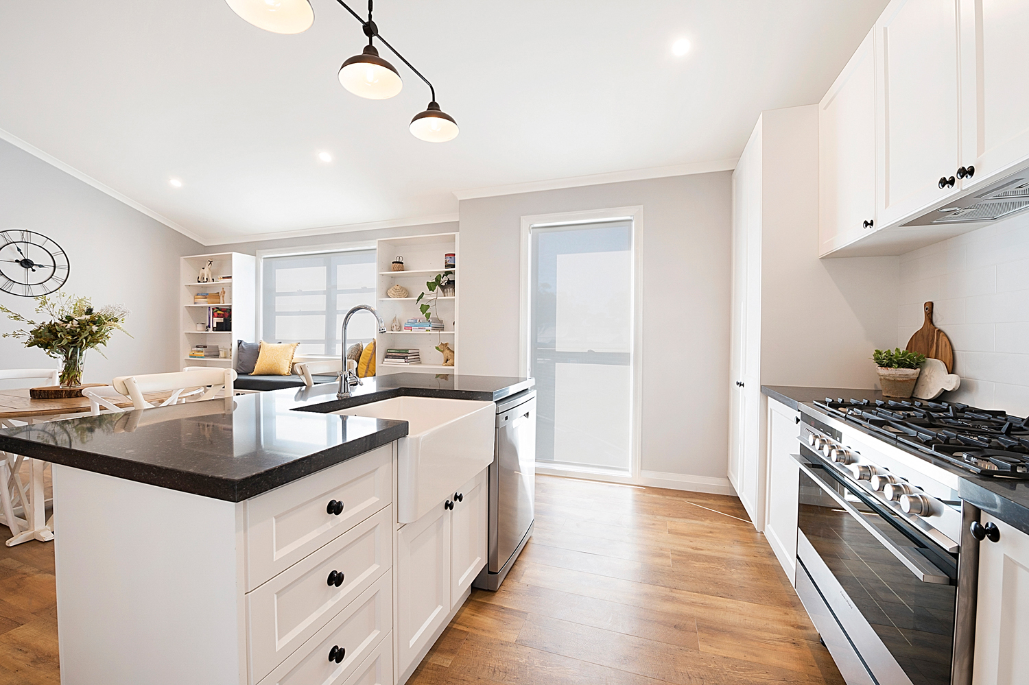 French country style kitchen, with Silestone stone bench tops, and Laminex cabinetry opens onto the dining space.