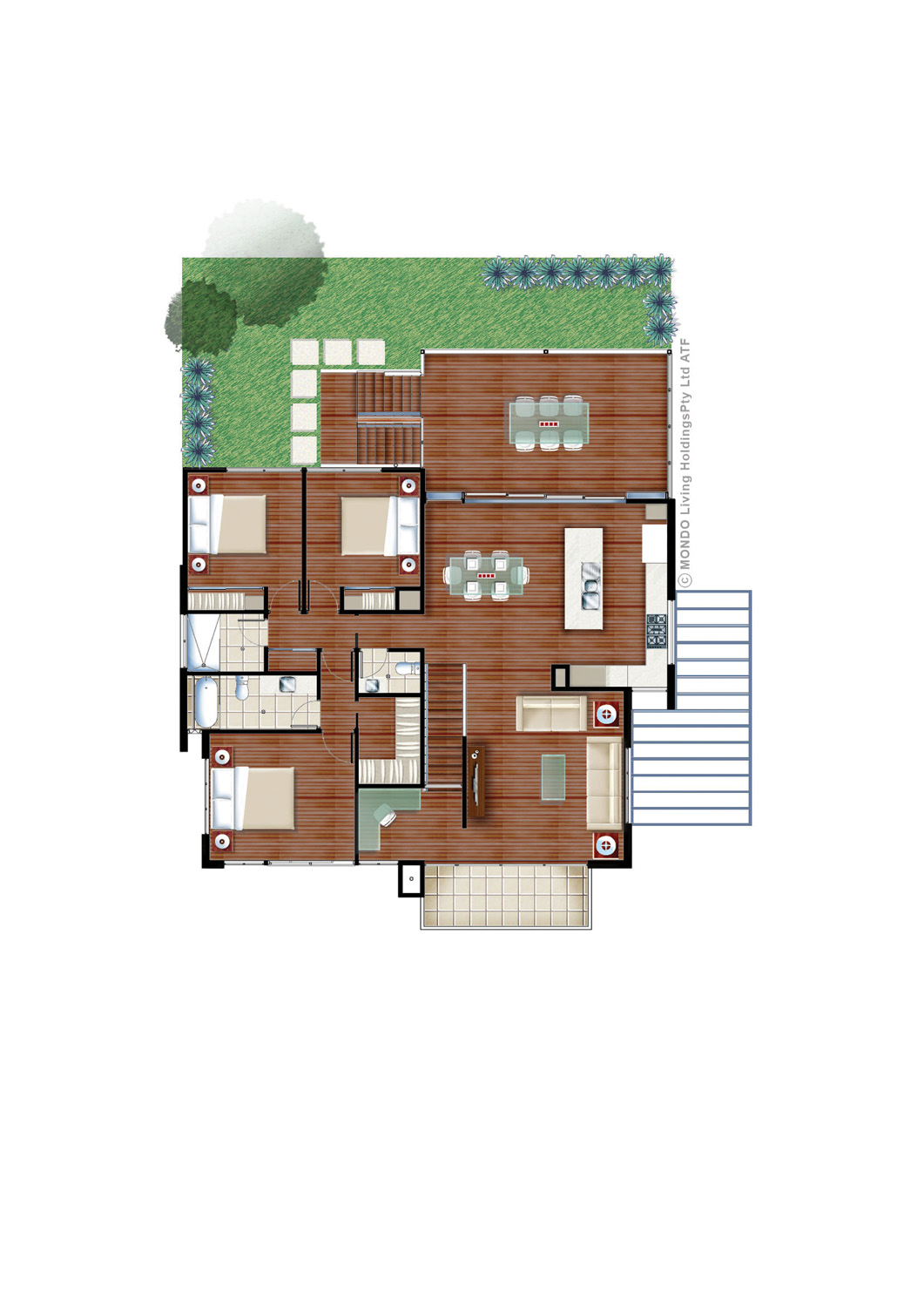 This family home was exactly what the owners desired. Using intelligent design, the Rivergum exemplifies the ideal inner city family home. Featuring four bedrooms plus study, three bathrooms, media room plus a spacious double garage and outdoor dining area, the options are in abundance. The home is built with zoned living in mind. The living area and three bedrooms are located upstairs, whilst the guest bedroom and the media room are on the lower level. This allows for both privacy and interaction.