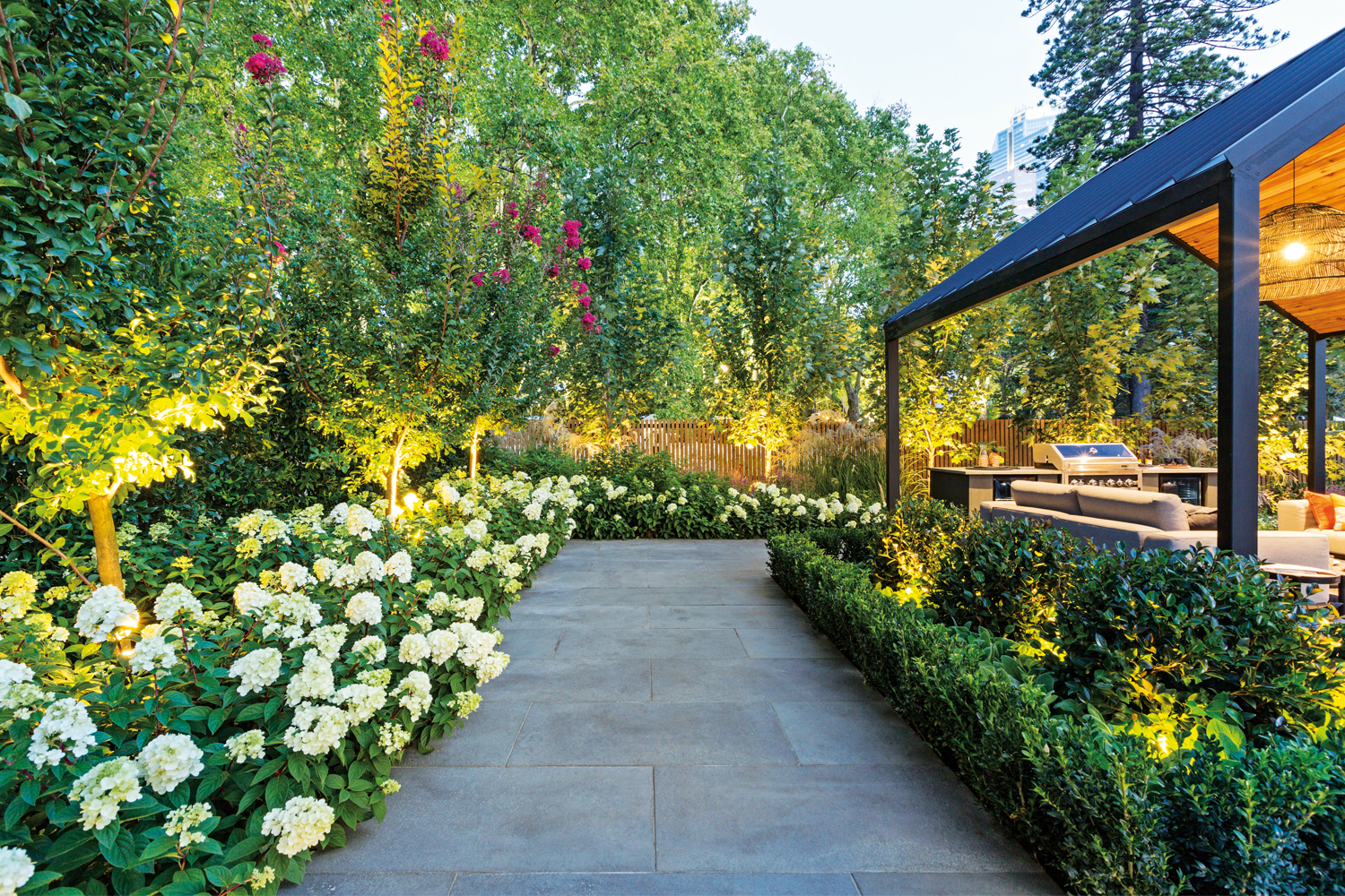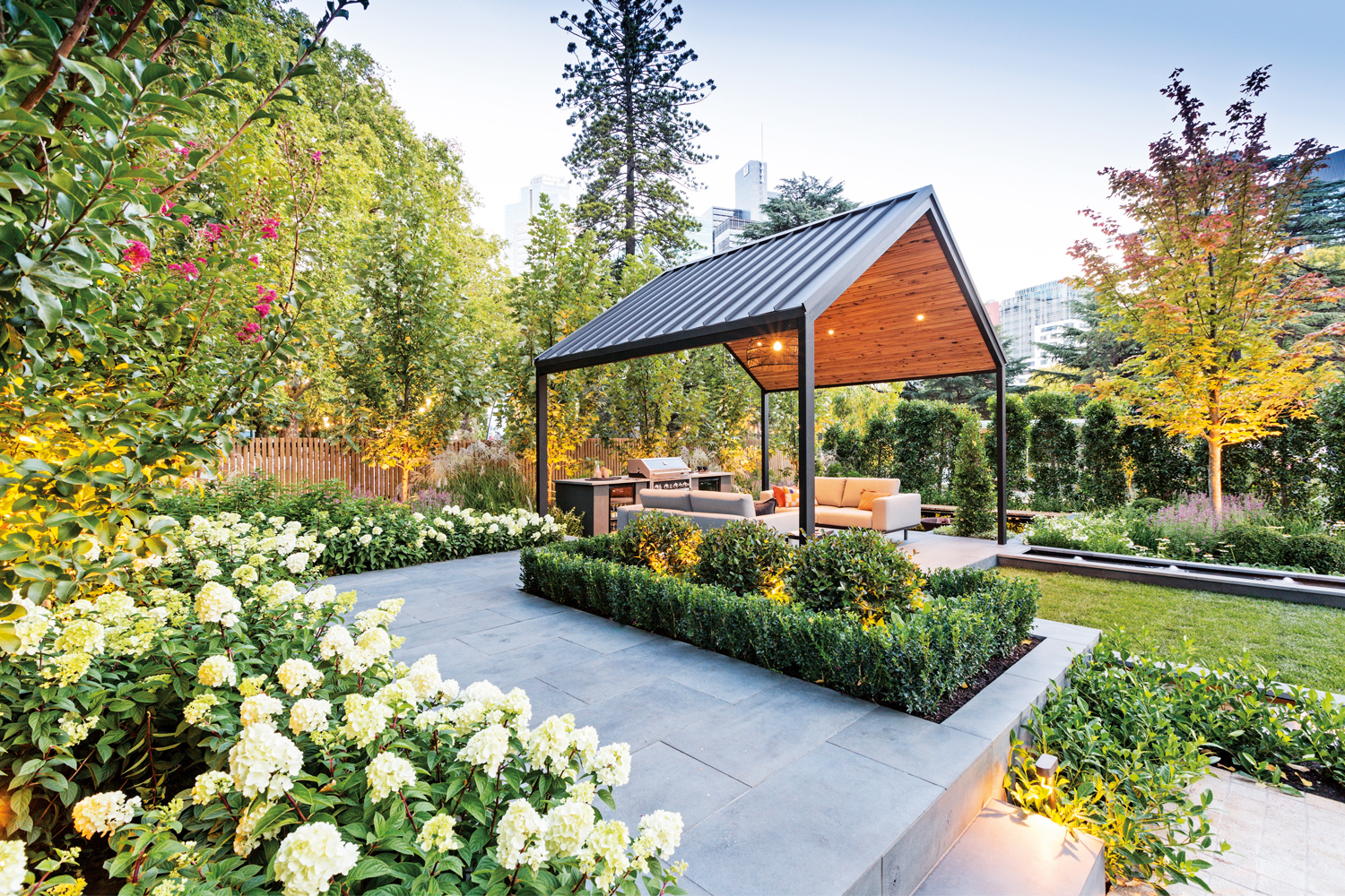 An ‘Autumn Blaze’ maple was installed at a mature height to help balance the scale of the garden — it does this by offsetting the height of the pergola. Ficus hillii hedges on each side are for privacy and a clean, green border. Lagerstroemia tuscarora was underplanted with Hydrangea ‘Sundae Fraise’ for some amazing colour along the bluestone pathway. Perennials and gardenias were chosen for lower-growing plant life in the foreground of the garden, ensuring the view would not be obstructed.