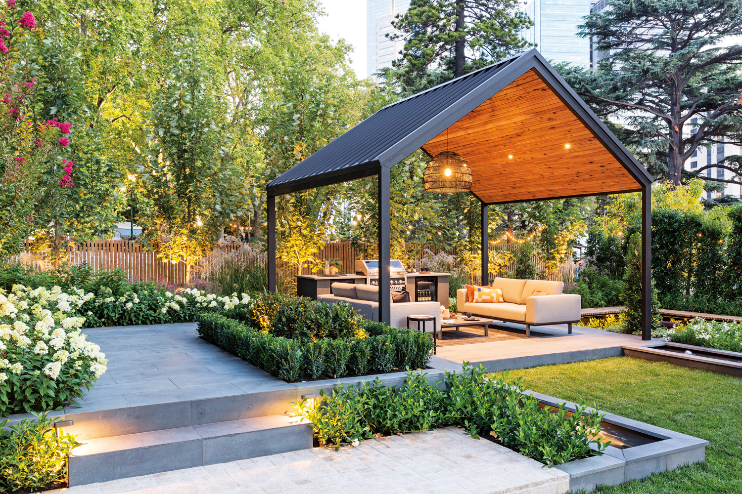 There is hidden lighting to place focus on the feature trees and also a strip light underneath the built-in bench seat in the fire pit area. Lighting helps create depth and also safety by highlighting level changes at night.