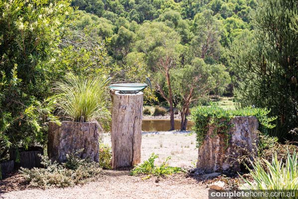 Adding to the rural ambience of the landscape, there is a charming bird bath set amid hollow log planters, as well as hand-split post and rail perimeter fencing and casual paths of earthy-coloured gravel. The effect is enhanced by the dry-stone retaining walls featuring locally quarried Tynong stone.