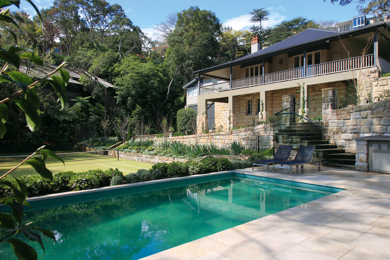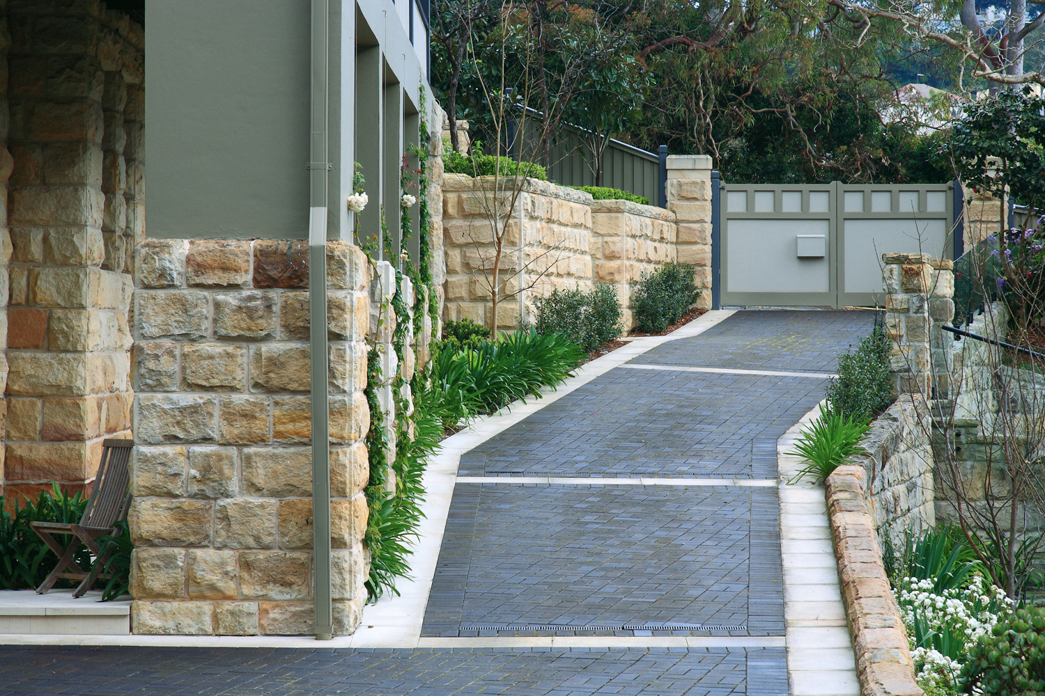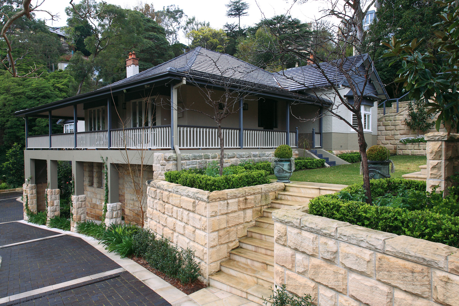 Every site poses certain challenges. In this instance, the block was steep with some unstable retaining walls, which needed to be rebuilt. The new retaining walls were constructed with reinforced concrete blocks veneered with hand-cut Australian sandstone. The walling complements the extensive sawn sandstone paving and steps.