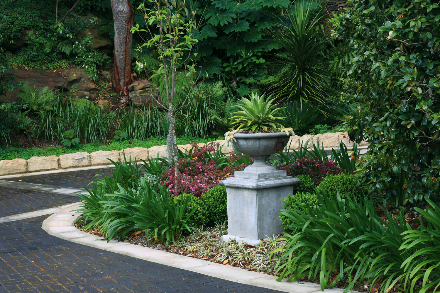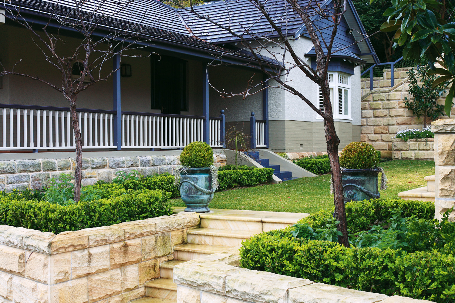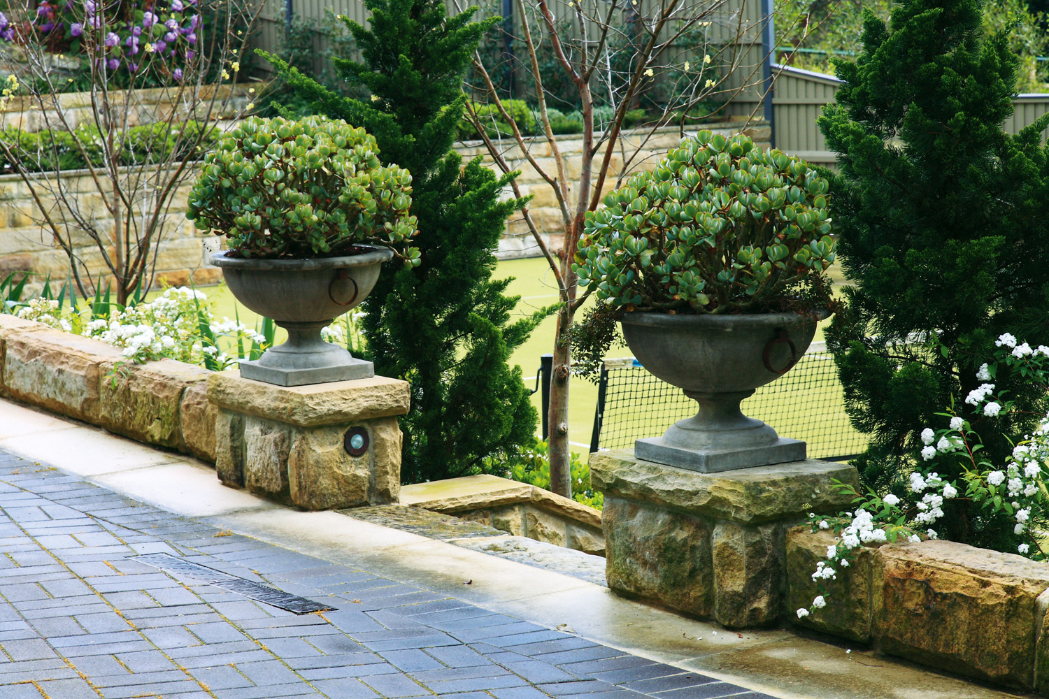 Every site poses certain challenges. In this instance, the block was steep with some unstable retaining walls, which needed to be rebuilt. The new retaining walls were constructed with reinforced concrete blocks veneered with hand-cut Australian sandstone. The walling complements the extensive sawn sandstone paving and steps.