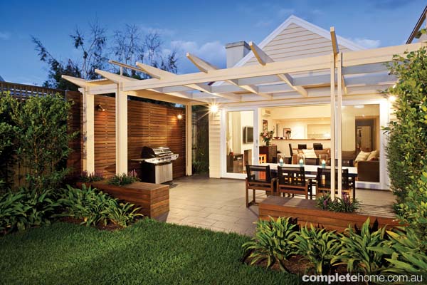 Sliding glass doors were installed to allow light into the home and forge a seamless connection with the new paved outdoor dining spot. “This space is framed with a painted timber pergola and particular attention was given to ensuring that the design of the ornate pergola tastefully integrated with the design of the house,” explains landscape designer Justine Carlile.