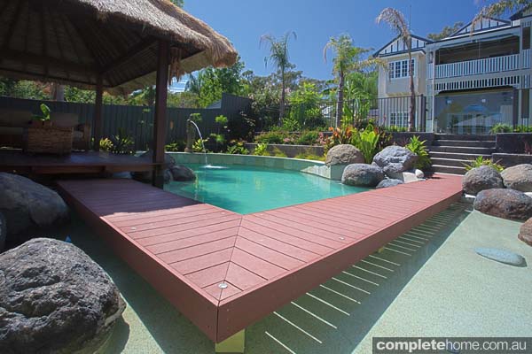 A path leads out from the house to the beautifully decked bridge, dividing the backyard space into a beach and main pool area, and finishes at the Balinese hut. Positioned over the pool, the hut allows you to sit and dangle your feet over the clear pool water, while shallow seats let you swim up and step directly into the hut.