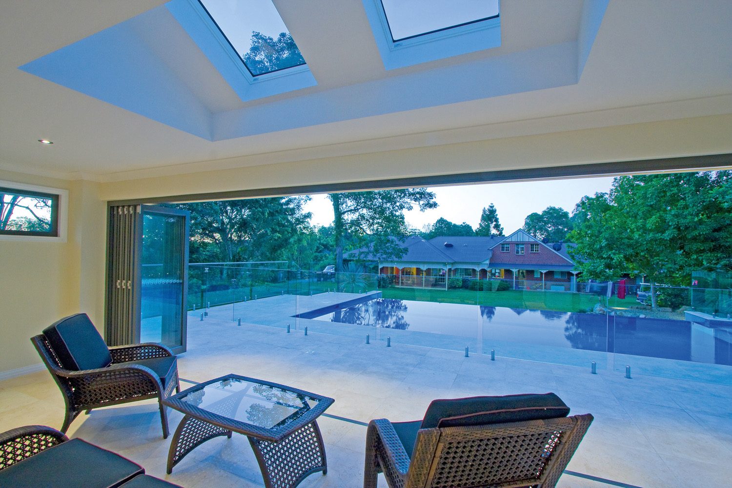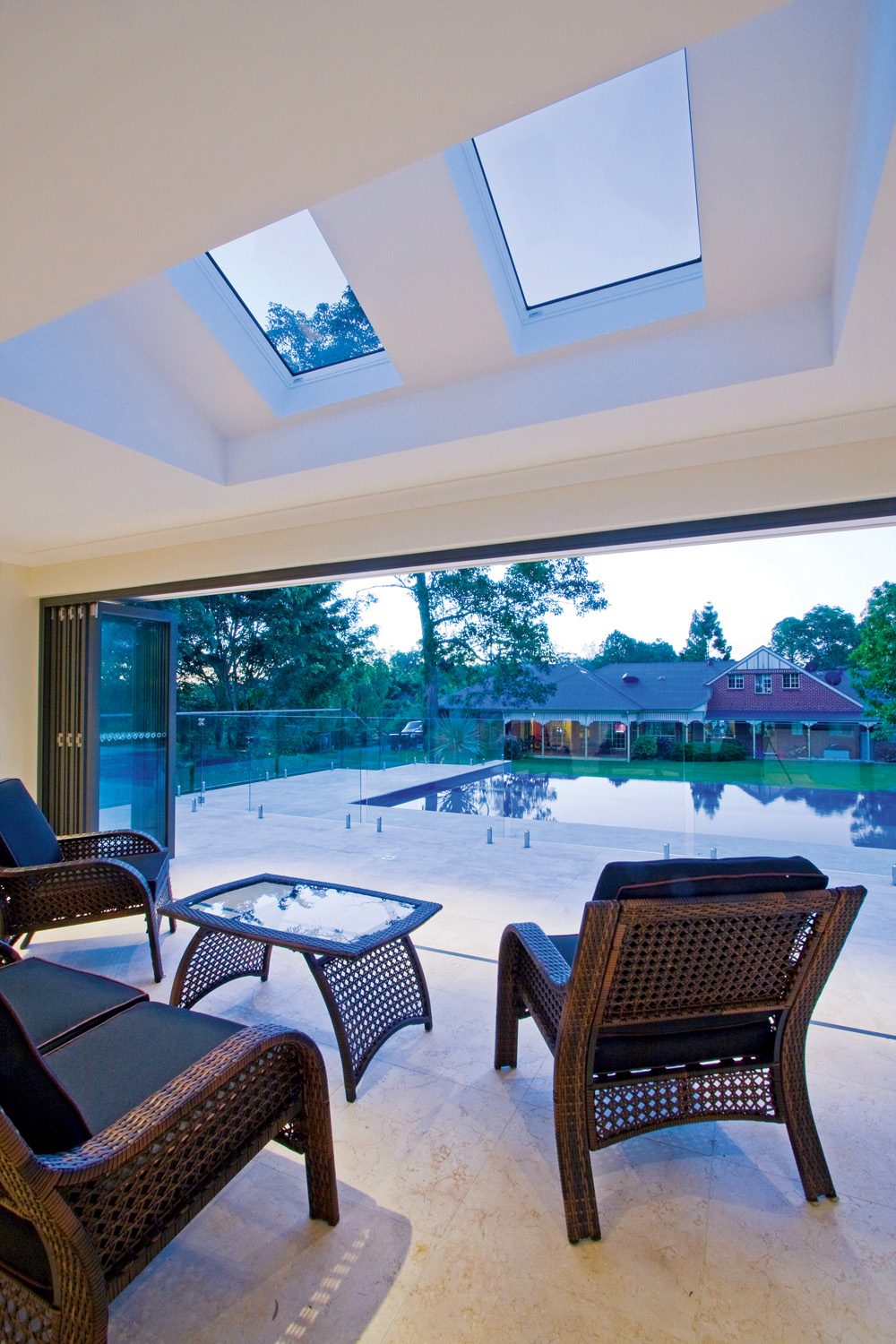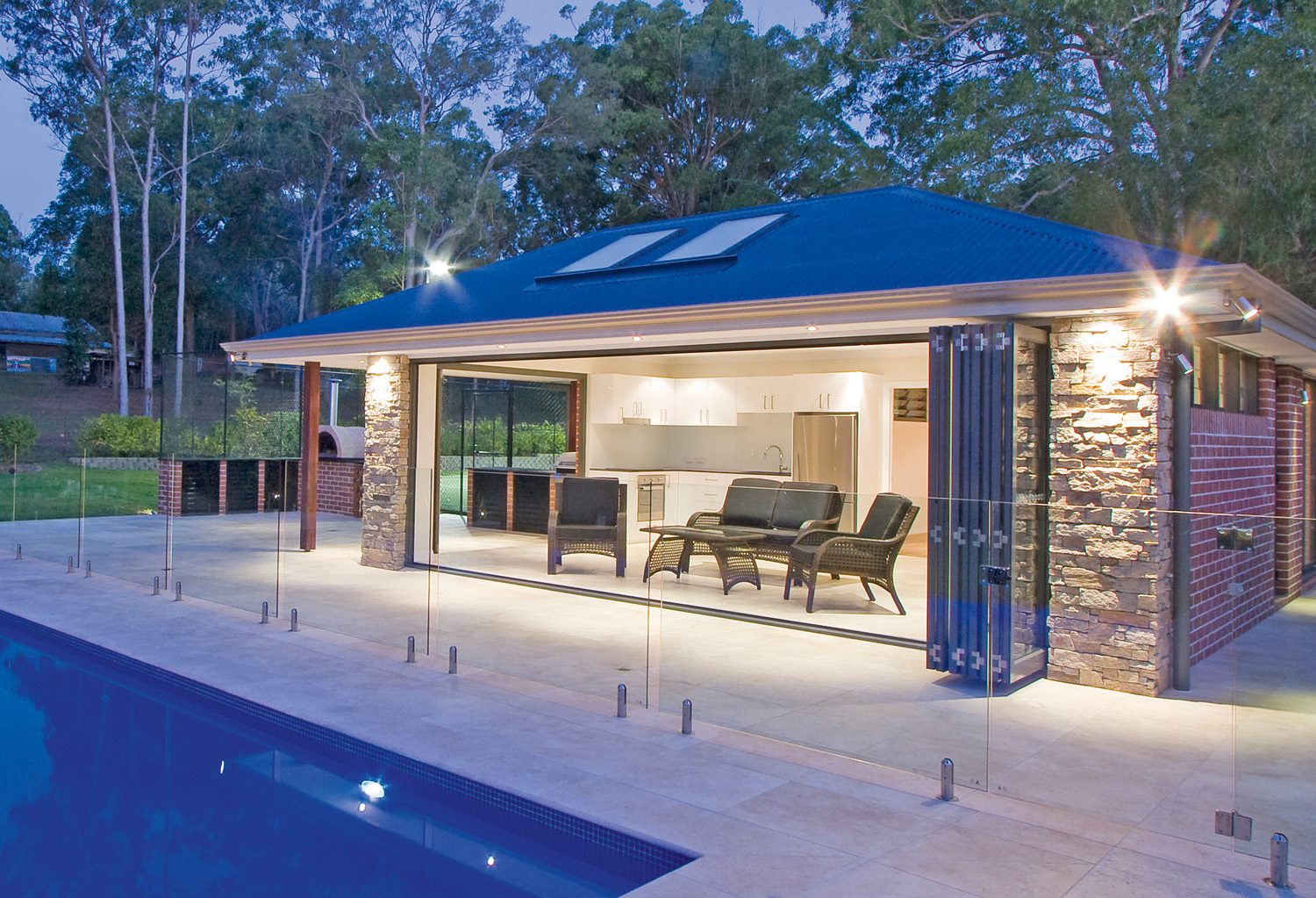The cabana that services the tennis court and swimming pool is surrounded by a large paved entertaining area with a wood-fired pizza oven and barbecue. The style of the cabana ensures the overall project is in keeping with the home design. The roof has been designed with a hip that visually links to the existing roof of the residence and allows for high ceilings and skylights. The brickwork of the residence has been matched and used extensively in the cabana and external barbecue to further forge a link between the two spaces.