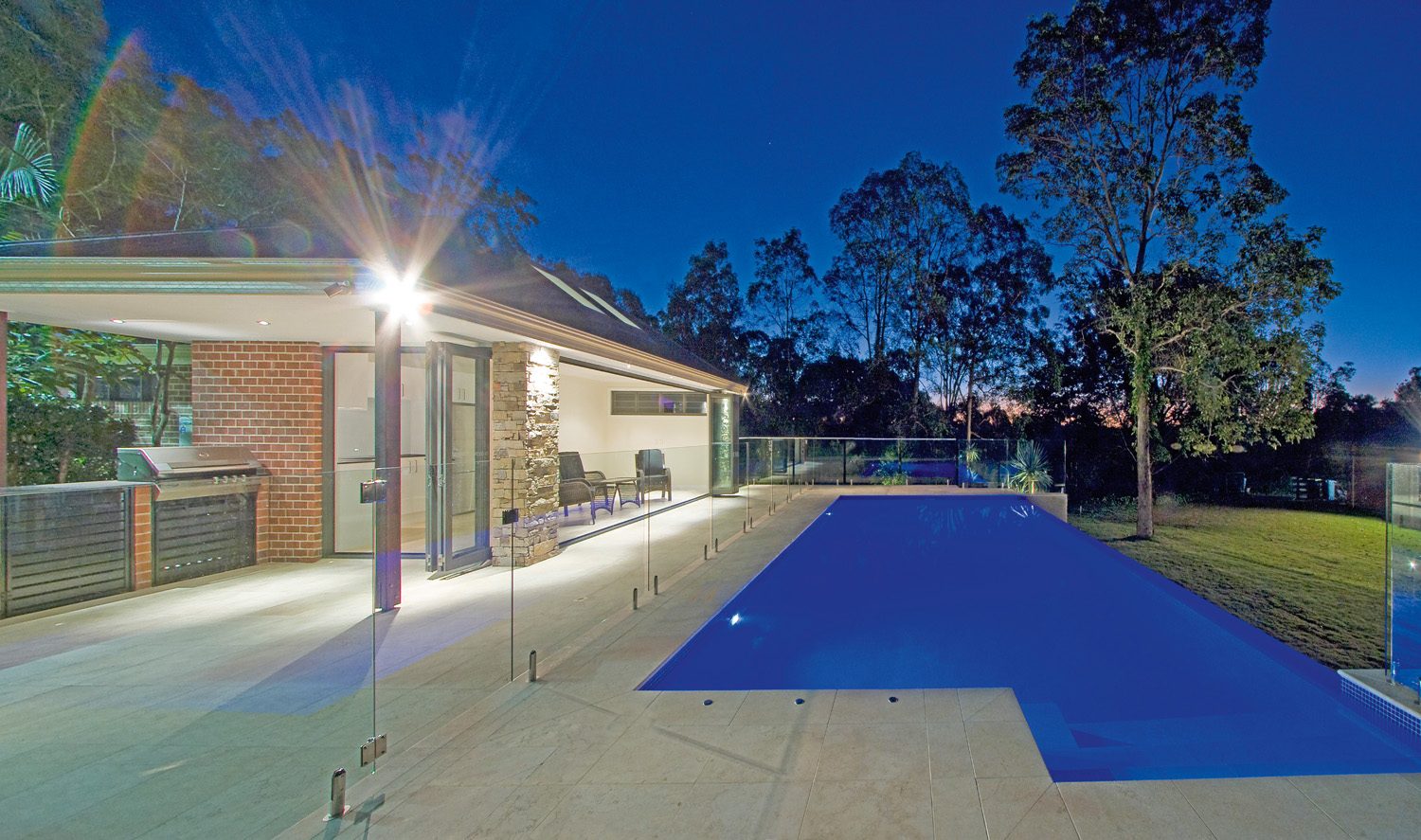 The extensive entertaining area of this Brisbane acreage property integrates a tennis court, cabana and pool. Designed by A Total Concept, the simple, clean lines create a contemporary design throughout the space.