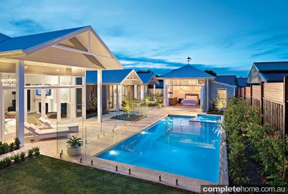 Frameless glass pool fencing makes the rear garden feel as open and spacious as possible and allows uninterrupted views from the home to the pool and landscaped spaces. The exterior and pool lighting make the area a joy to use at night, an experience enhanced by the uplighting of feature trees to create focal points.