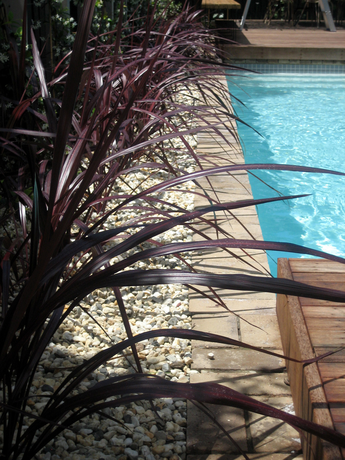 Expert tip: A pool area revamped to link the house to the outdoors: the Cordyline Red Fountain teamed with what will grow to be a wall of star jasmine is not only beautiful year round, but it copes well with pool splashing.