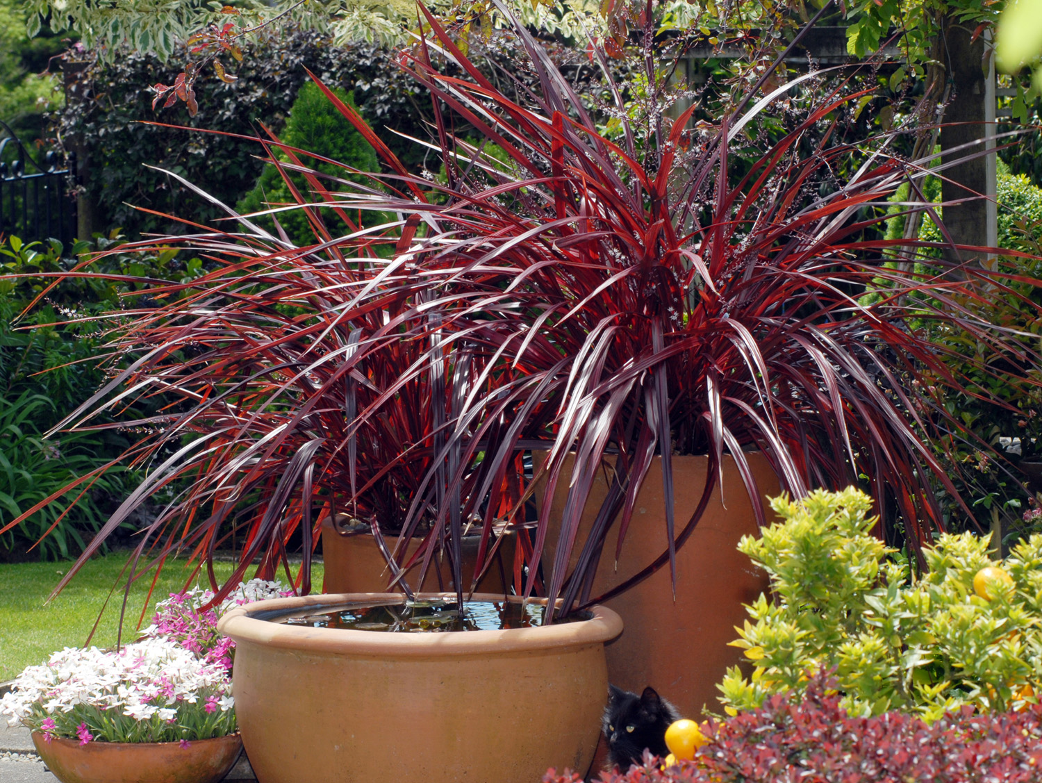 Top tip: Pots have always been a brilliant way to raise the profile of plants without actually building raised beds. Here Red Fountain plays hero while flowering annuals and a small pond add dimension to the grouping.