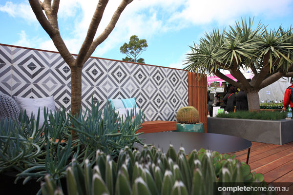 The key features of the rooftop balcony included an ‘Encaustic’ tile feature wall, a spotted gum canter leaver bench seat, spotted gum timber flooring and screening and a blue stone planter box.