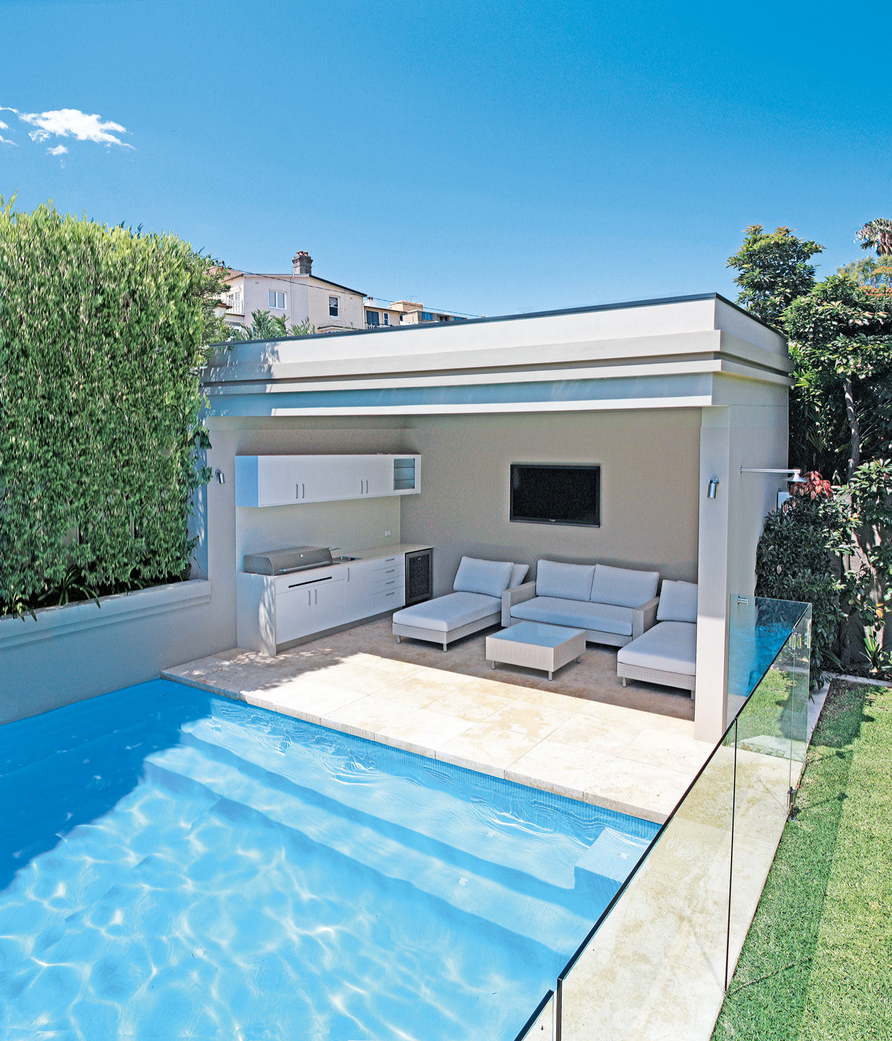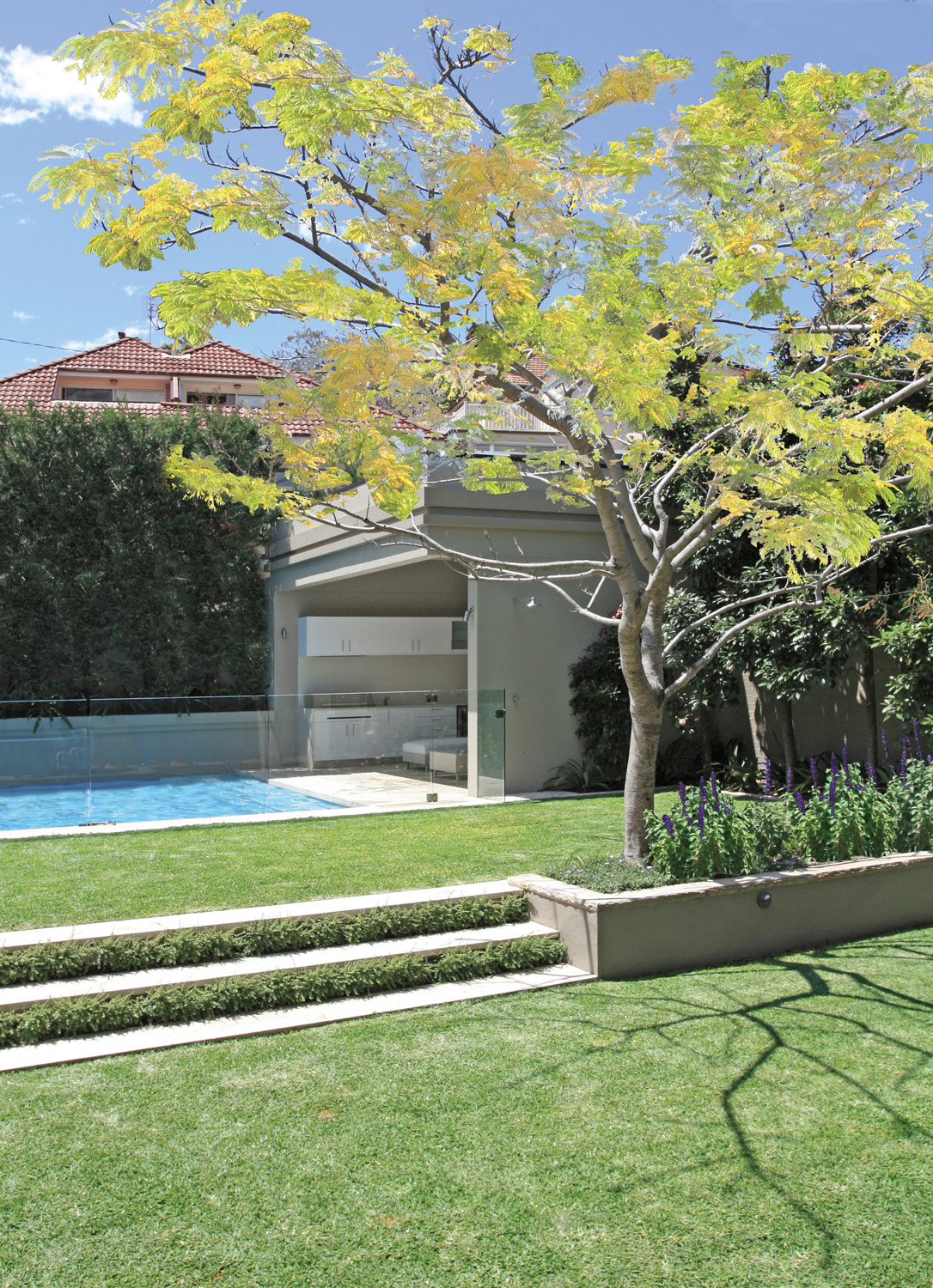 The project was undertaken by A Total Concept Landscape Architects and Swimming Pool Designers and encompasses a courtyard with a cabana and pool, plus a lawn and gardens, creating the feel of a contemporary European resort.