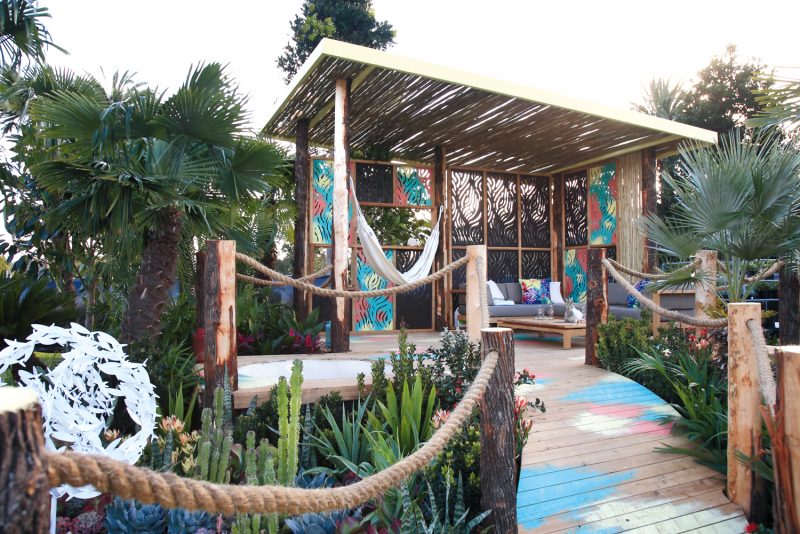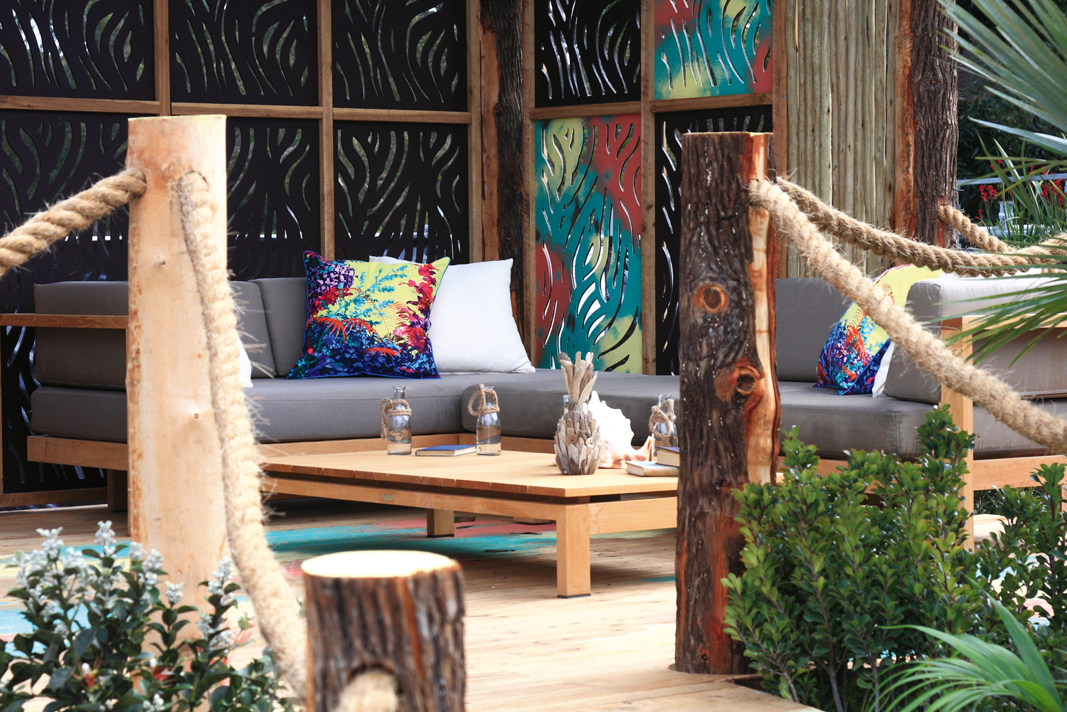 A timber boardwalk flanked by post-and-rope handrails led past a “sea of coral” to a beach hut outfitted with a lounge and hammock. The hut roof featured sustainably sourced latte hardwood poles from Touch Wood Trading, while the walls were fashioned out of Outdeco’s new Wooloomai patterned screen panels.