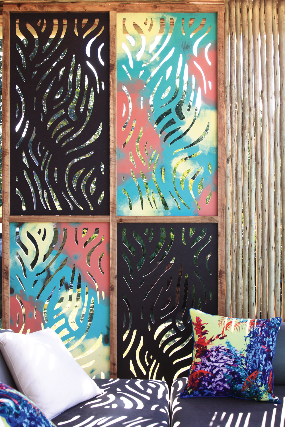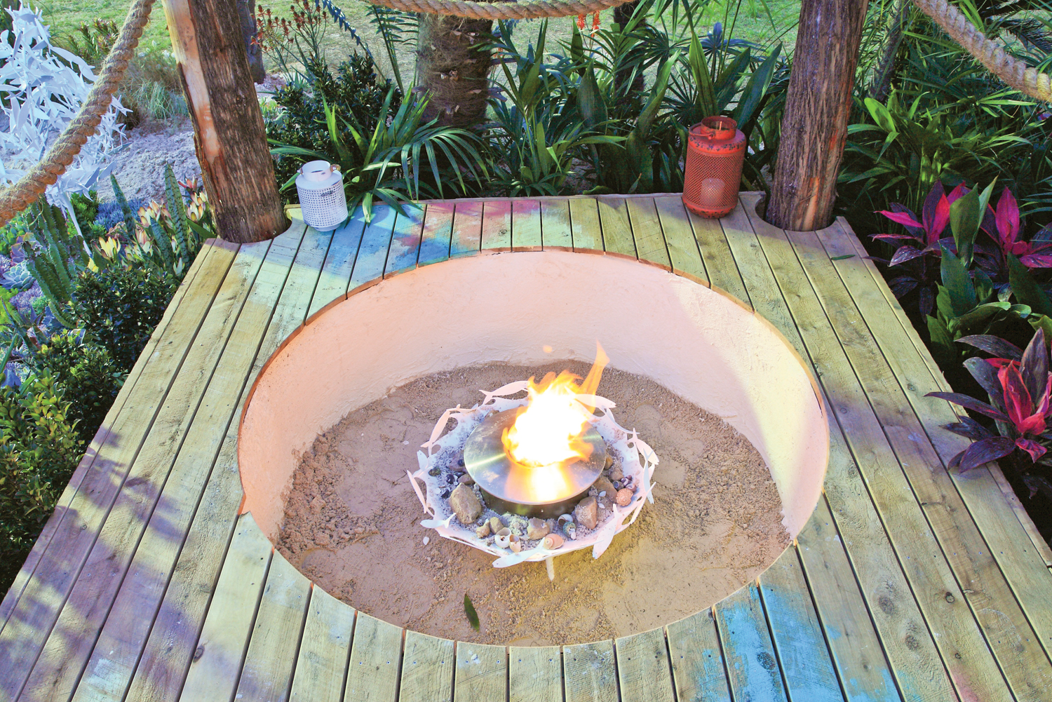 The wave-like pattern of the screens’ design reinforced the island theme and some were painted to add a splash of tropical colour and tie in with the timber decking. A sunken fire pit was located just a few steps away from the hut, providing a cosy place to gather.