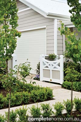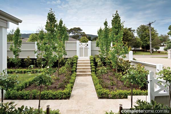 Of modern formal design, the individual courtyards and outdoor spaces, all of which were built by Bayon Gardens, that surround the home feature carefully considered planting schemes which provide shade in summer and allow natural light to flood the home in winter. The front-garden layout is formal, yet the planting is quite relaxed. Along the fence line, Teddy Bear magnolias soften the change of levels, ornamental pears are used as feature trees, and ficus form an informal hedge in front of the house. These plantings are complemented by a low English box hedge along the pathway, which adds definition to the design.