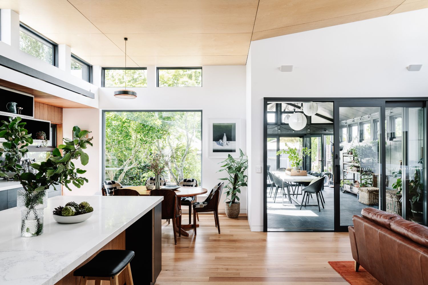 Another way to increase the indoor-outdoor connection in living spaces is through extending spaces vertically. “Creating height is also important; with high glazing we could throw light deep into the space,” says Fiona. “It also allows a connection to the sky, which can be cut off at times with busy urban roofscapes. At night you can see the full moon from inside.”
