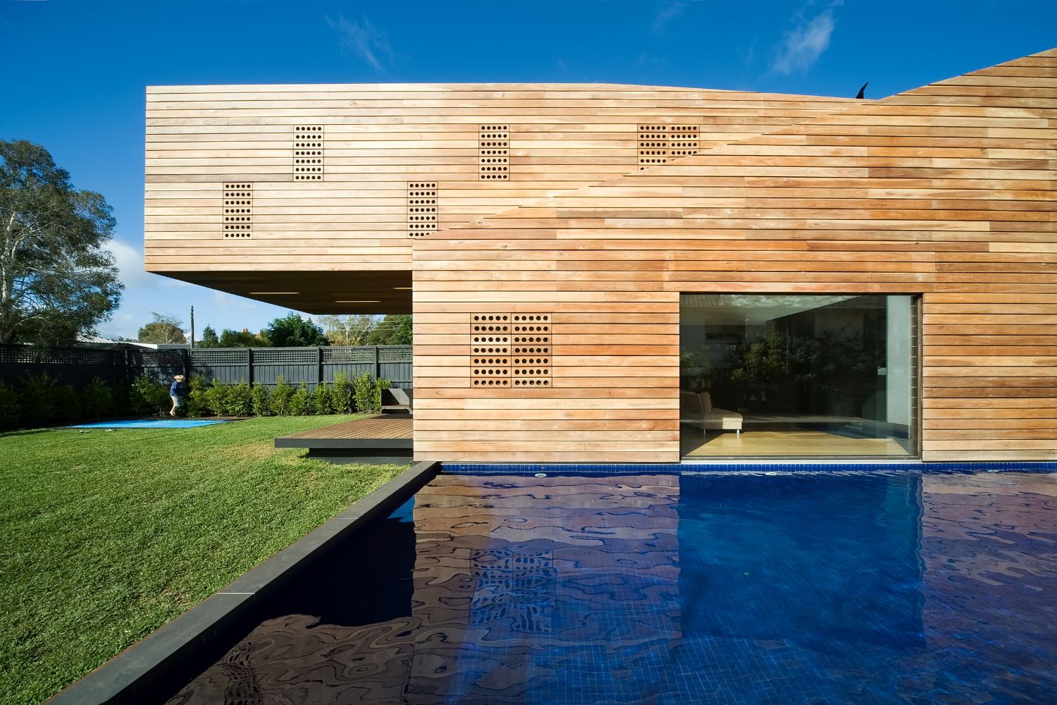 Making the most of your front yard is another clever way to improve connectivity. “Standing in the kitchen of the home, you have a view to the front yard, which is the kids’ playground with trampoline, basketball hoop and vegetable patch. It’s a hard-working front yard.”