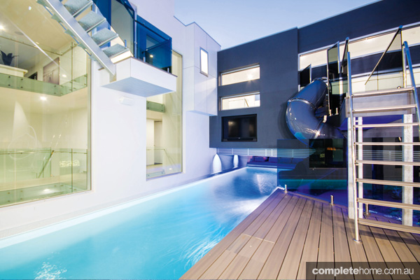 If you are after some extra fun, take a ride down the impressive waterslide, which has easy access steps located from the decking level. The pool and outdoor living spaces are perfect for entertaining family and friends. Utilising all areas of the confined courtyard, this pool design combines practicality with luxury, making it the complete outdoor living room.