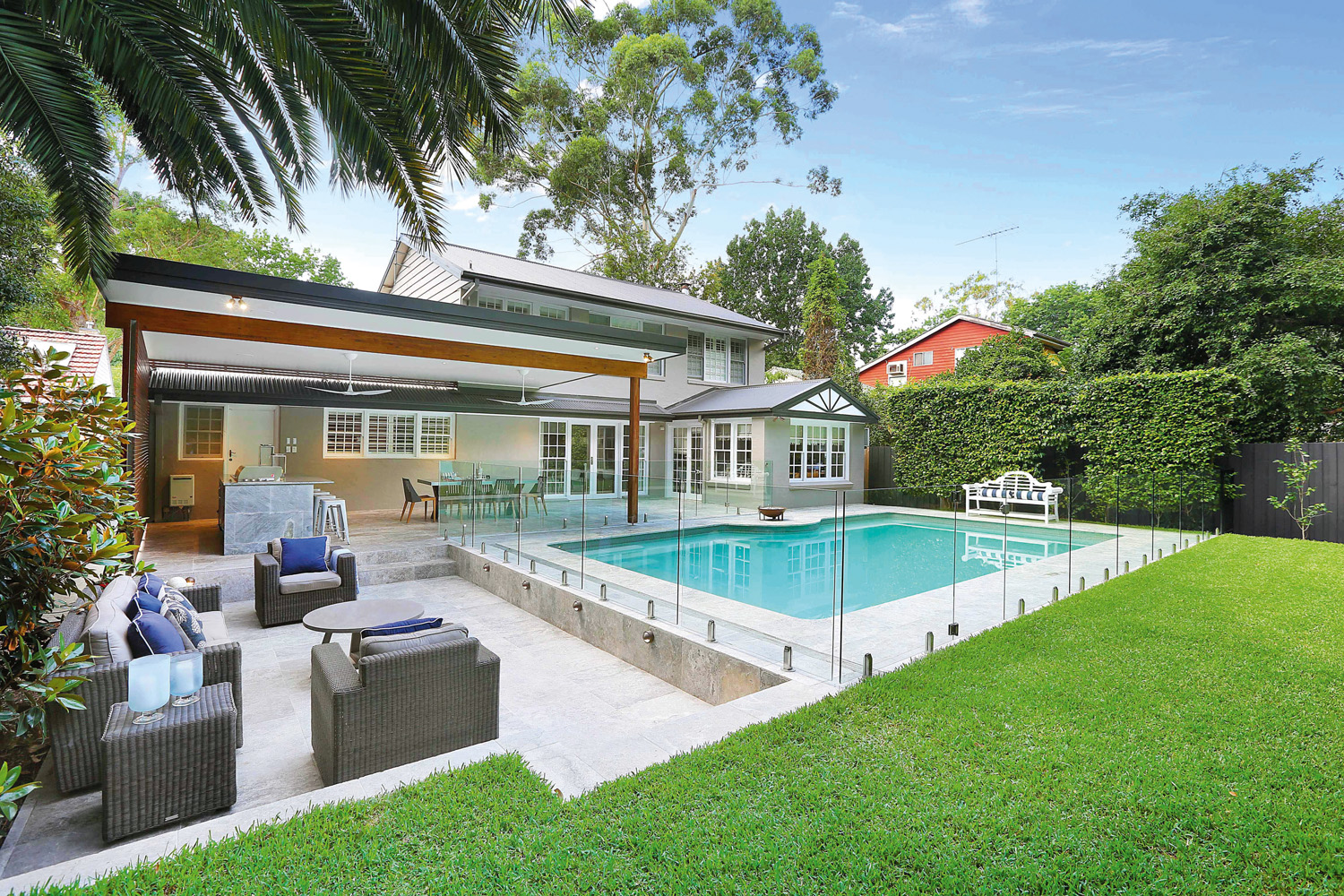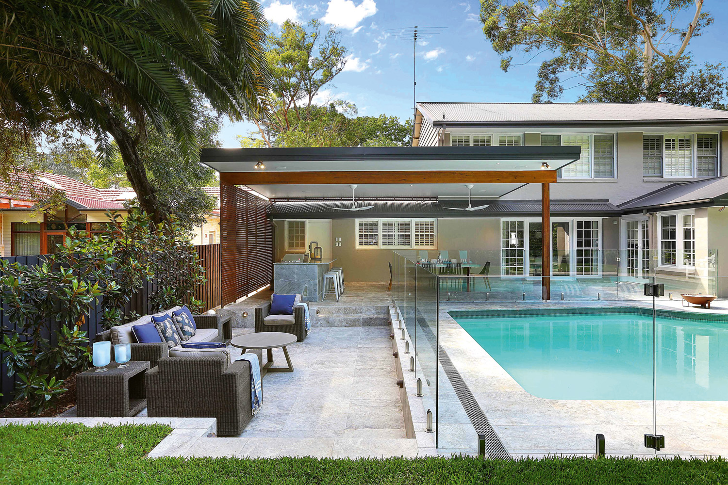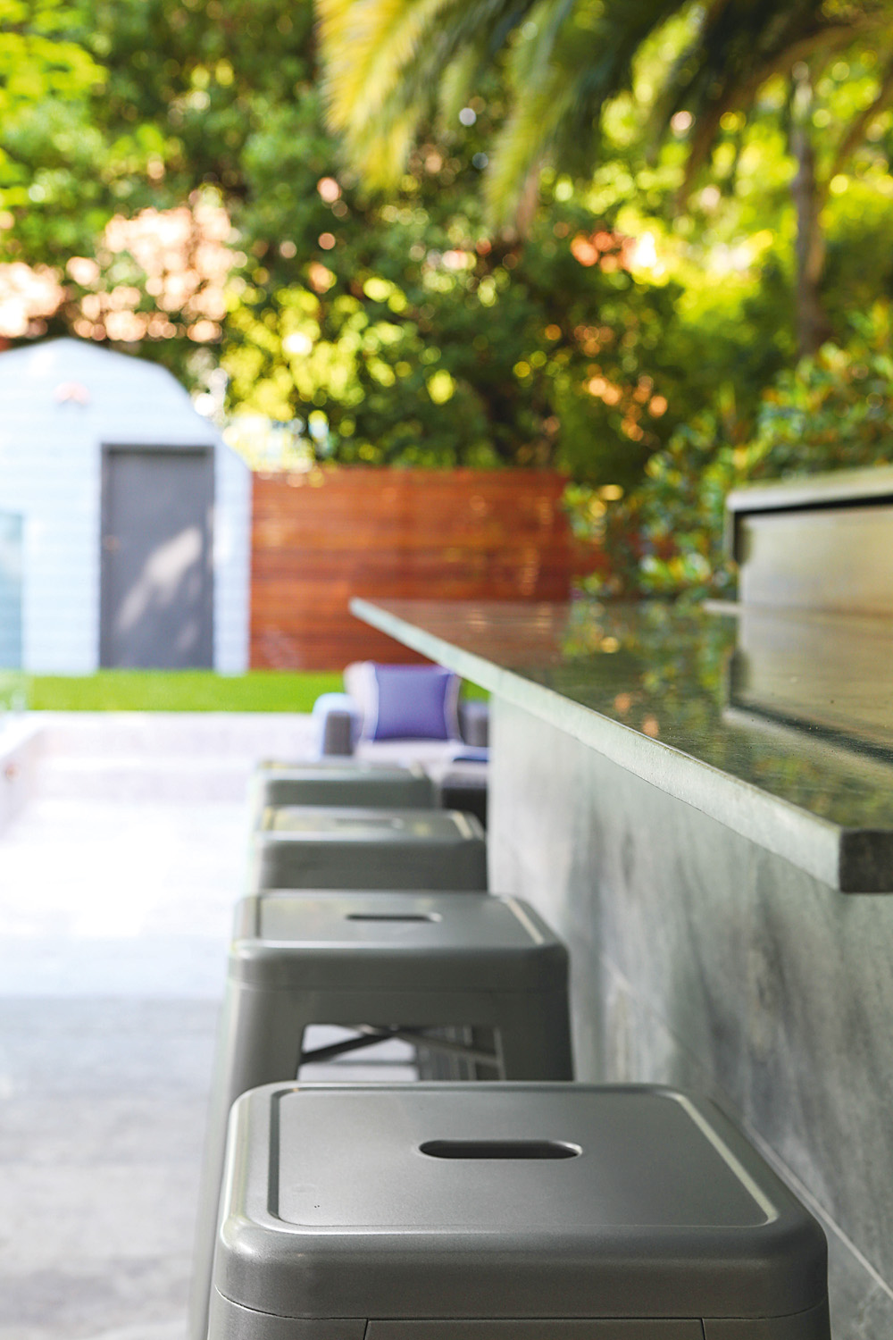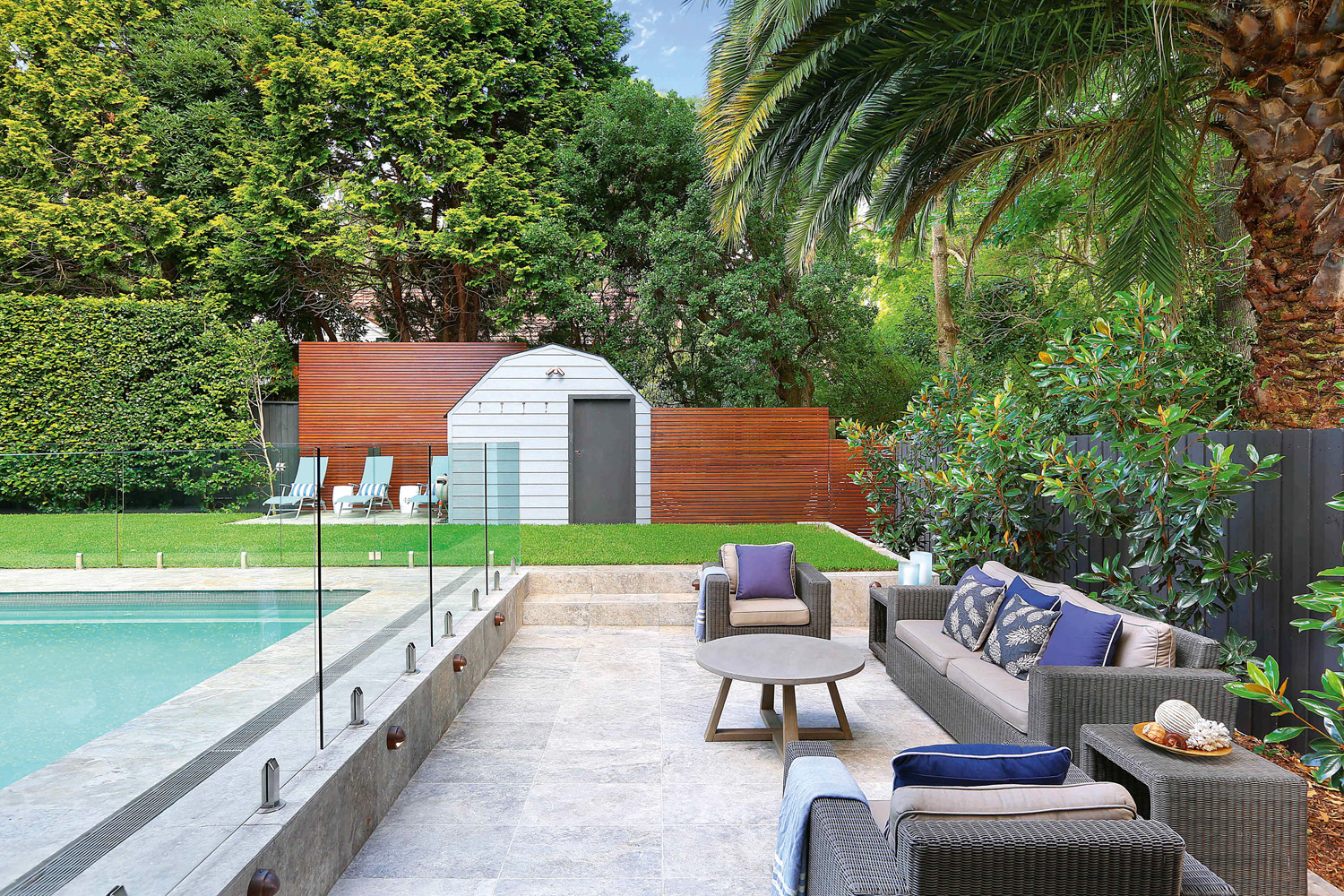 The rear garden was designed by Luke Roodenburg of Sand & Stone Landscapes, who created a holiday-at-home retreat that has the simple elegance the owners demanded, and the variety of outdoor living spaces they required.
