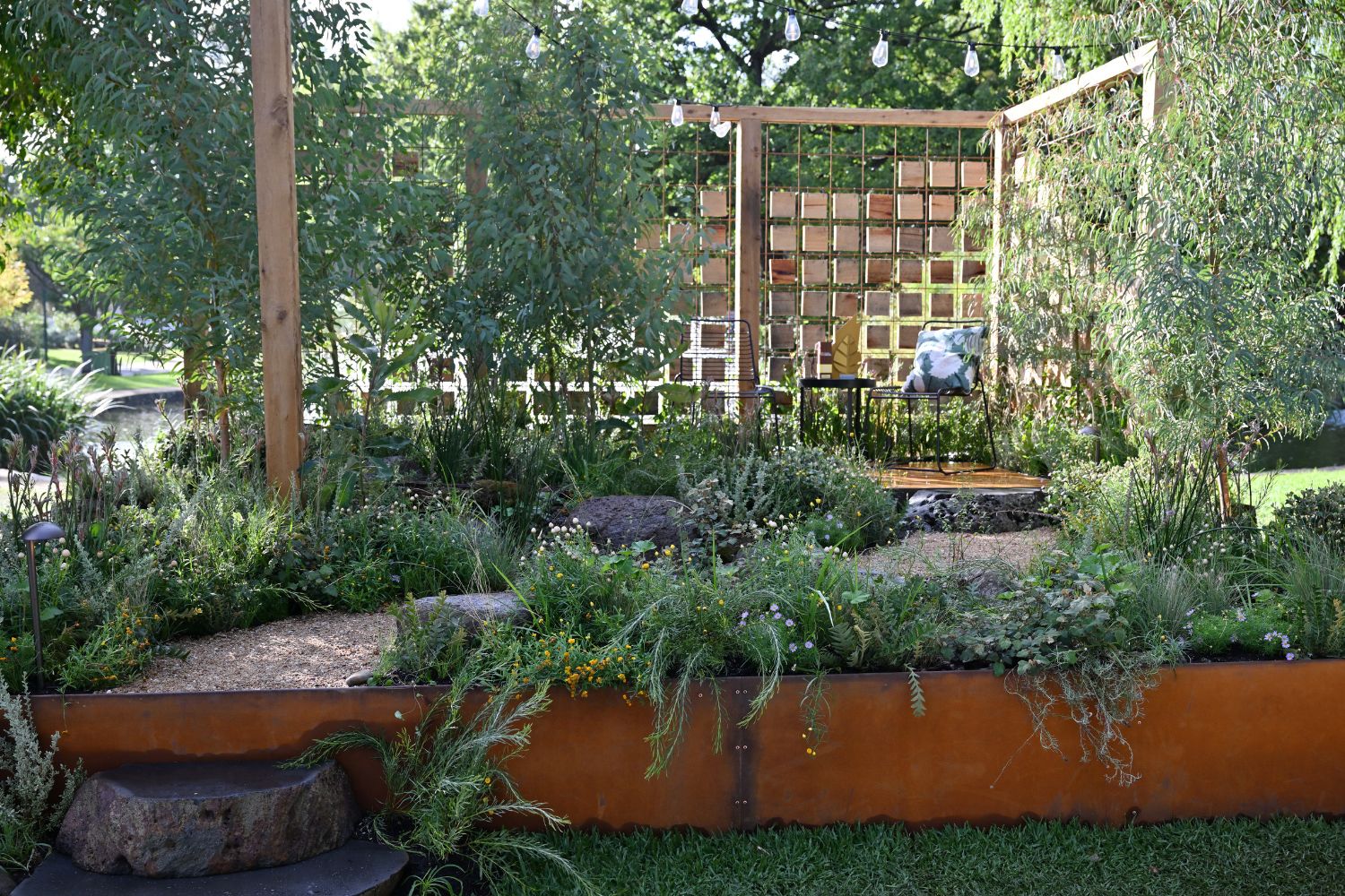 From boutique gardens to commercial exhibitor plots, ShapeScaper products were spotted throughout MIFGS. Modular planters and signature edging lines appeared in a variety of contexts, reflecting the adaptability of the range. One example was RE-SET by Joslyn Bennett of Earthcore Landscapes, Gold Medal winner in the Boutique Garden category. An exploration of the power of nature as a restorative force, the garden used curved lines to create fluidity while the palette of soft greens, earthy timbers, Redcor patinated steel, and stone elements grounded the space.