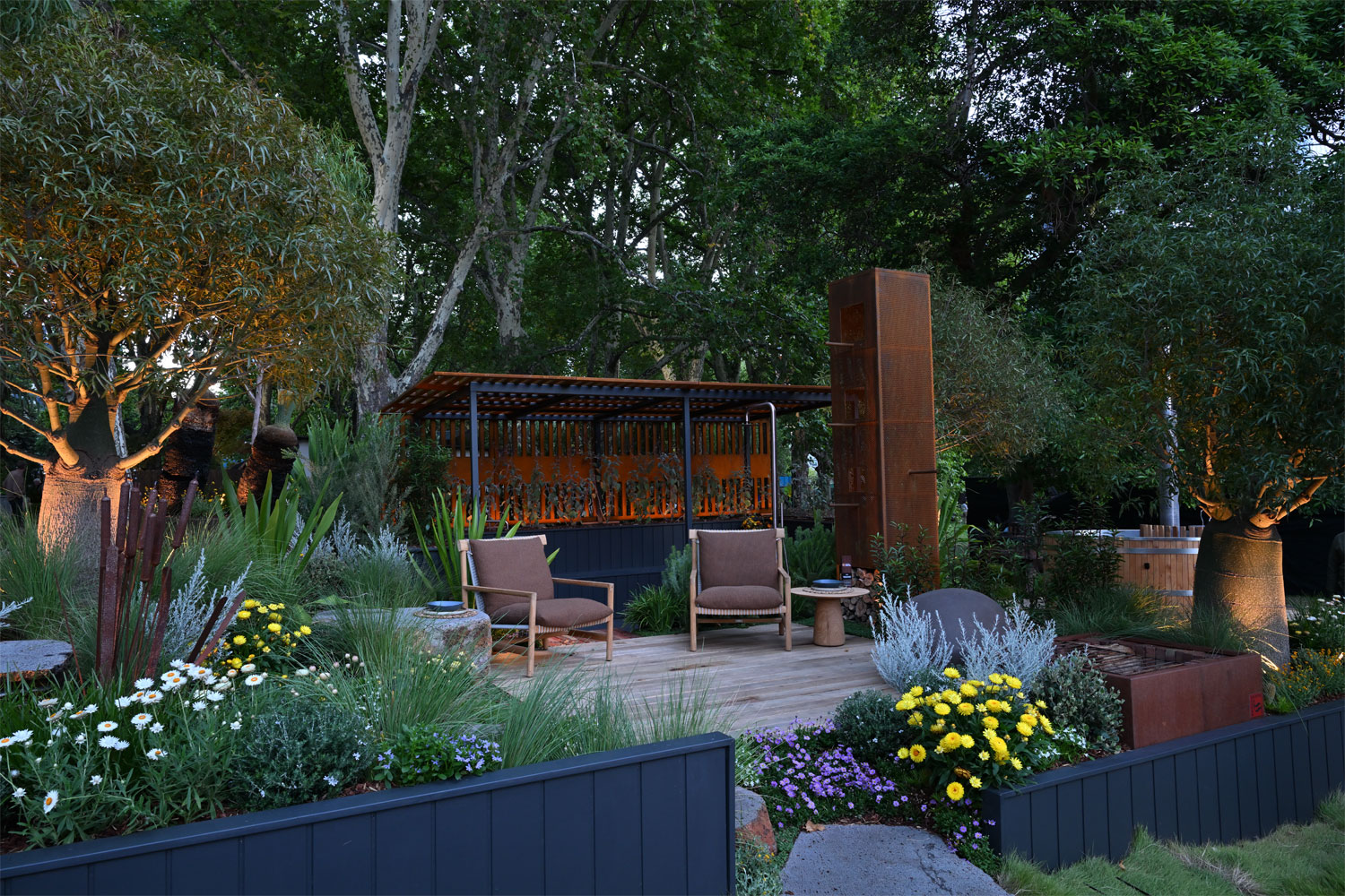 Designed to immerse MIFGS visitors in a modernAustralian landscape experience that celebrated durable materials, organic forms, and native plants, the display featured a circular seating zone formed with custom Corten steel and timber-topped benches. A copper water feature added movement, its edges softened by curved steel borders and lush planting.