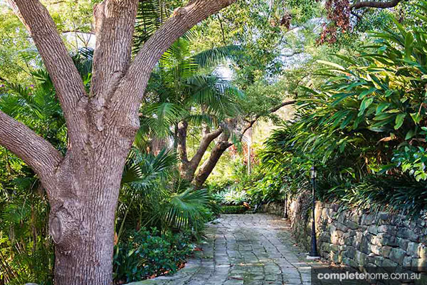 The space is large and shades most of the area with the canopy of treetops. The design uses pathways, retaining walls, and a large grass area to create structure to the rambling cottage-style garden.