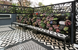 The previously established street-facing wall was painted and a black powdercoated steel gate and matching privacy screens installed on all sides. “The ornate lines of the screens create a juxtaposition to the wall when observed from the street, but mimic and complement the plants of the vertical garden when seen from inside,” says Brenton.