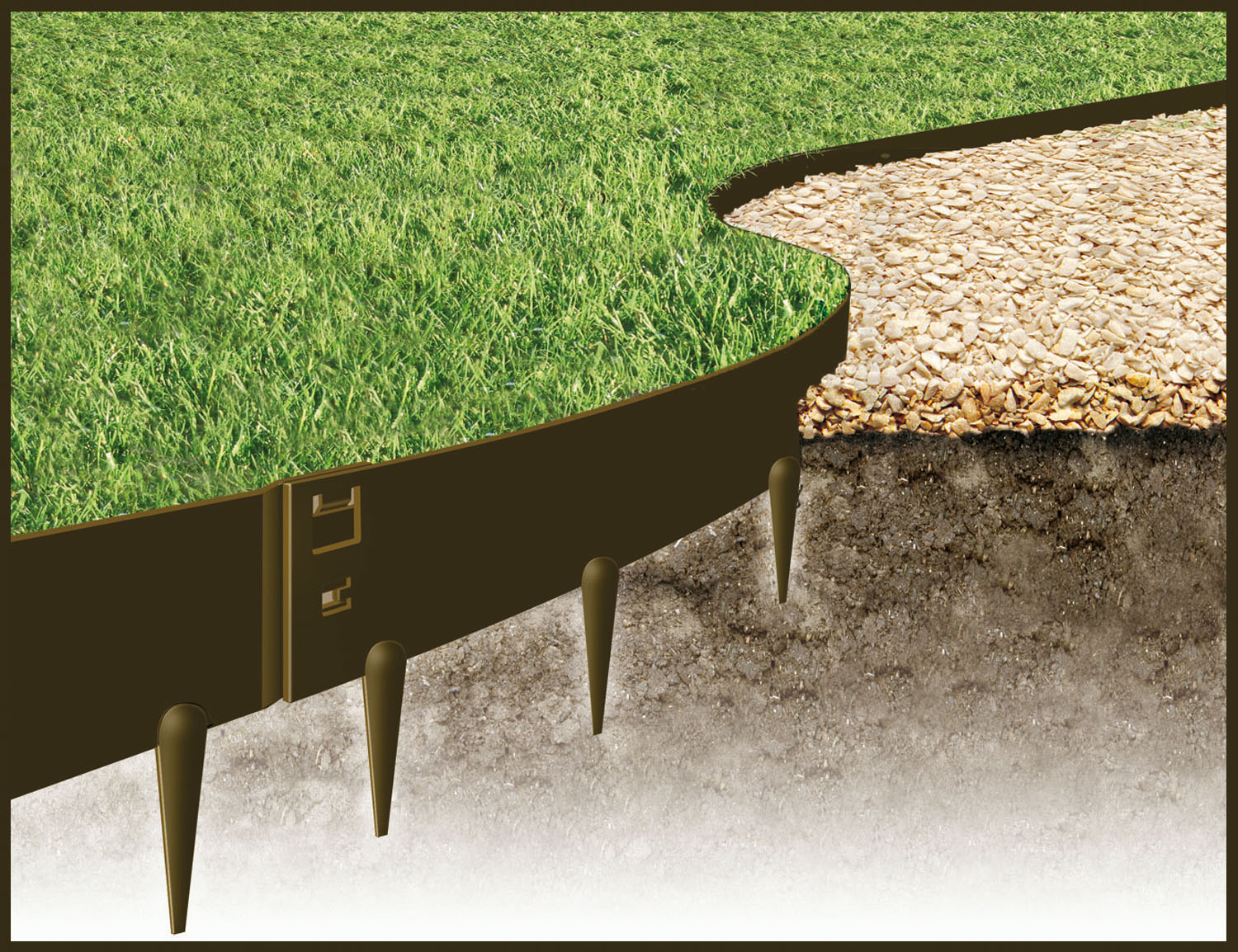 Made from 90% recycled 1.6 mm mild steel, EverEdge takes the hard work out of installation. The malleable finish means it can be shaped by hand without the need for special tools. Installation is quick and easy, the product is simply hammered directly into the ground using the spikes that are part of the metre lengths which easily interlock. EverEdge works perfectly with a wide variety of garden materials including synthetic grass, pavers, rolled tarmac, gravel and pebbles as well as all mulches and natural grasses.