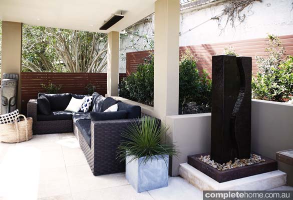 The palette of materials and colours was developed with care. Josh wanted a light-coloured paving tile, but he didn’t want something that would reflect the sun’s rays too much, causing glare and heating up the space. He chose travertine tiles from Eco Outdoor and opted for a large format (800mm x 800mm) to help make the space seem bigger than it really is.