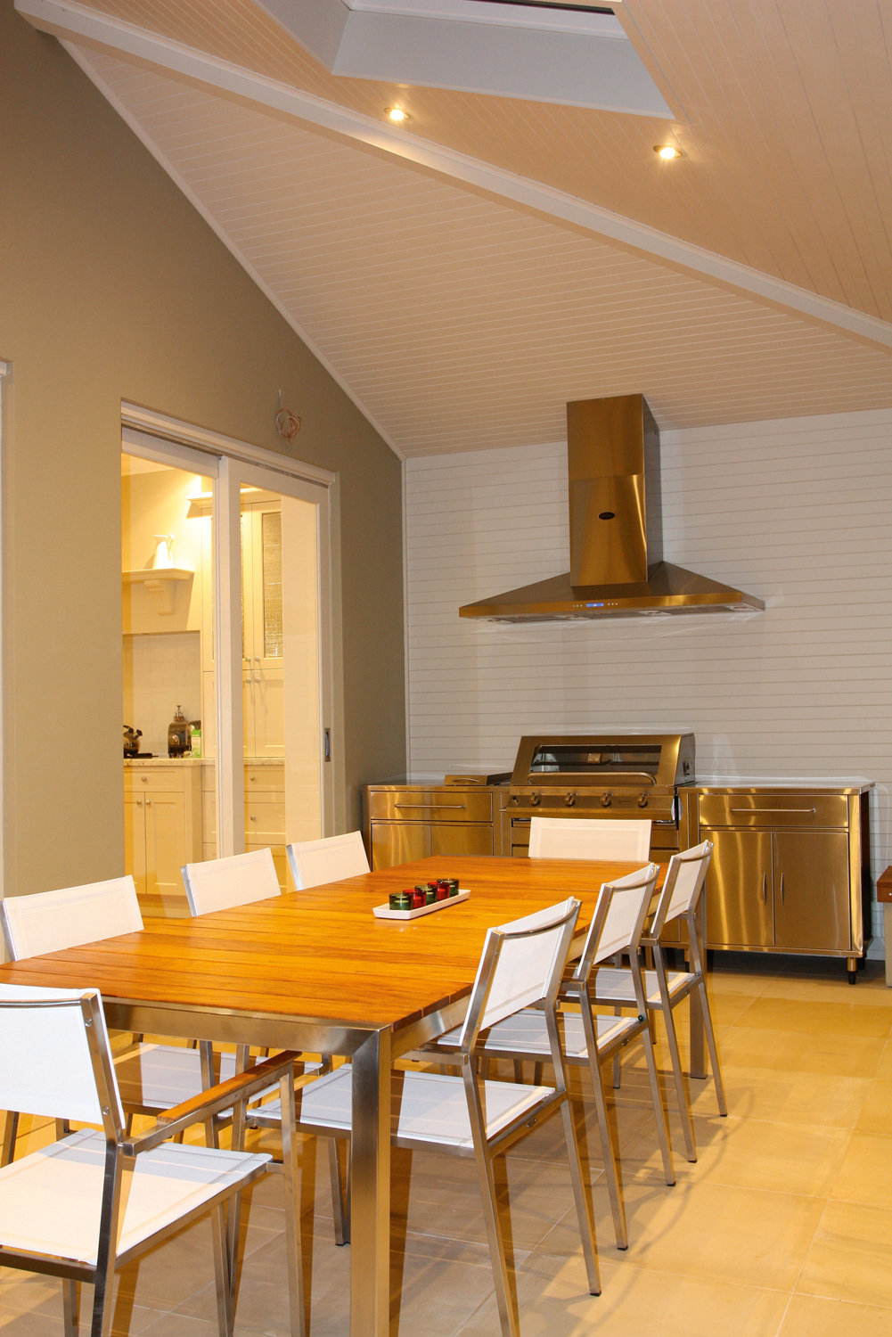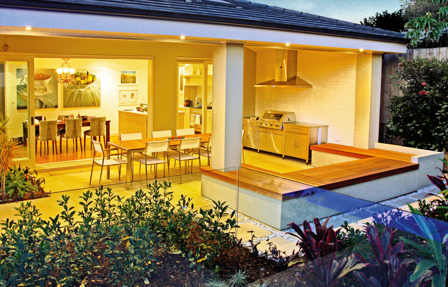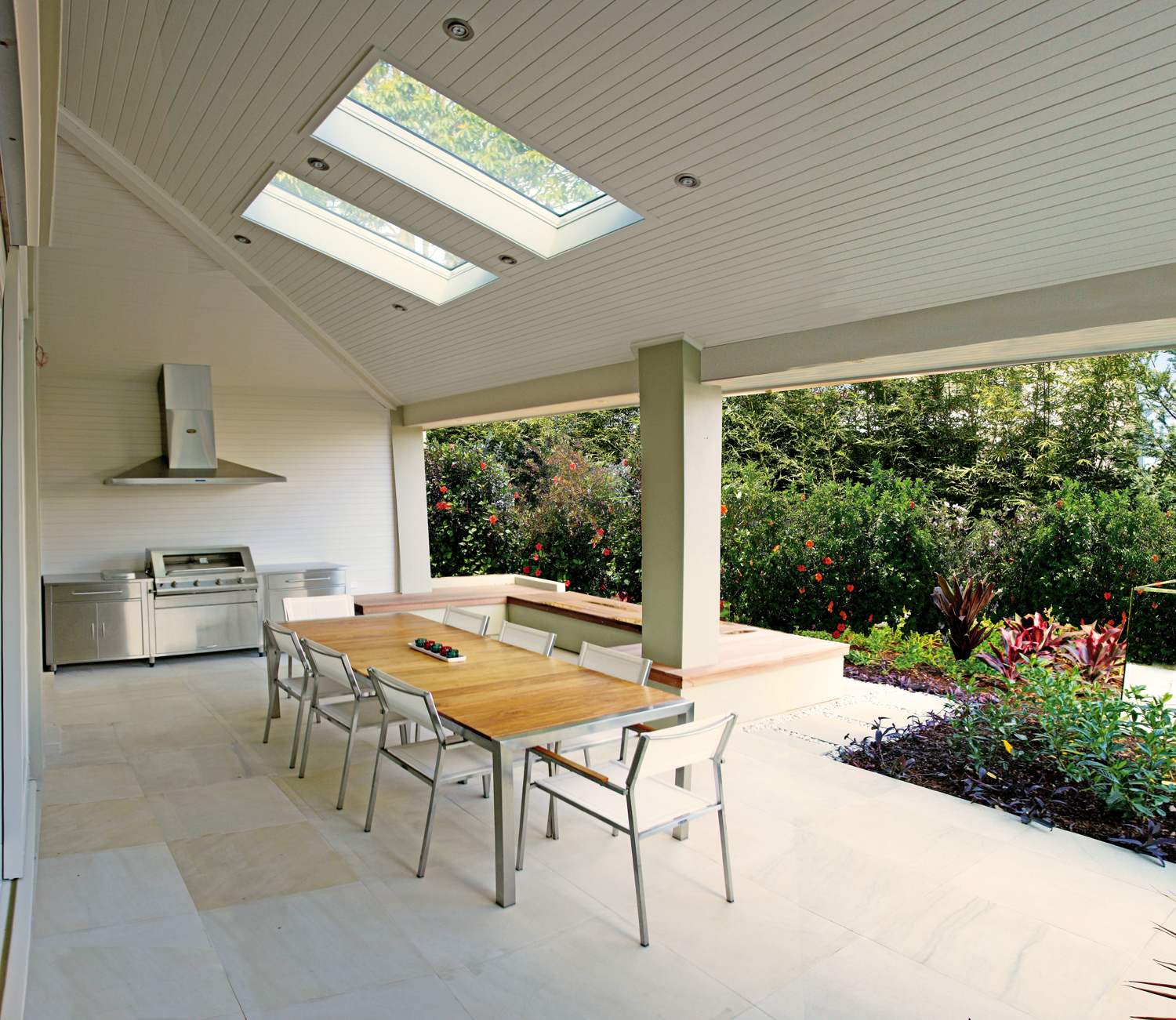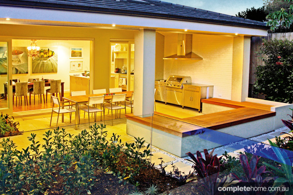 The design of the entertaining area is characterised by simple clean lines and the space is accessed via full-width sliding timber doors that ensure total integration of the home with the garden. “As the owners have young children, the outdoor room provides the perfect shaded entertaining area where they can relax with friends yet still watch the children as they play in the adjacent pool,” adds John.