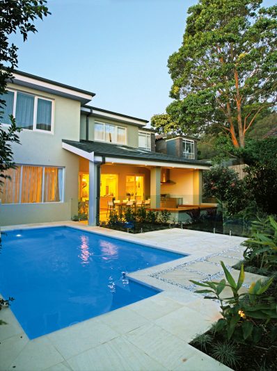 The pool, which was also designed by A Total Concept Landscape Architects, is clad in shimmering, vibrant blue tiles and acts as an elegant contrast to the blond sandstone poolside paving. The pool steps and underwater bench double as informal seats within the pool and with heated spa jets incorporated into the backrest, this is the perfect place for parents to chat.