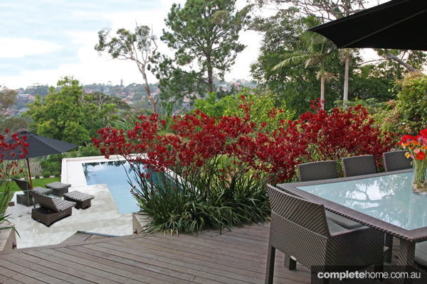 A planting theme unites the swimming pool and outdoor rooms, using a simple palette of Anigozanthes flavidus ‘Red’ (Red Kangaroo Paw), Syzygium ‘Cascade’ (Lillypilly), Juniperus Conferta (Shore juniper), Westringia fruticose (Coast Rosemary), Liriope ‘Evergreen Giant’ (Liriope), Phormium ‘Chocolate’ (Brown Flax) and Agave attentuatum (Agave).