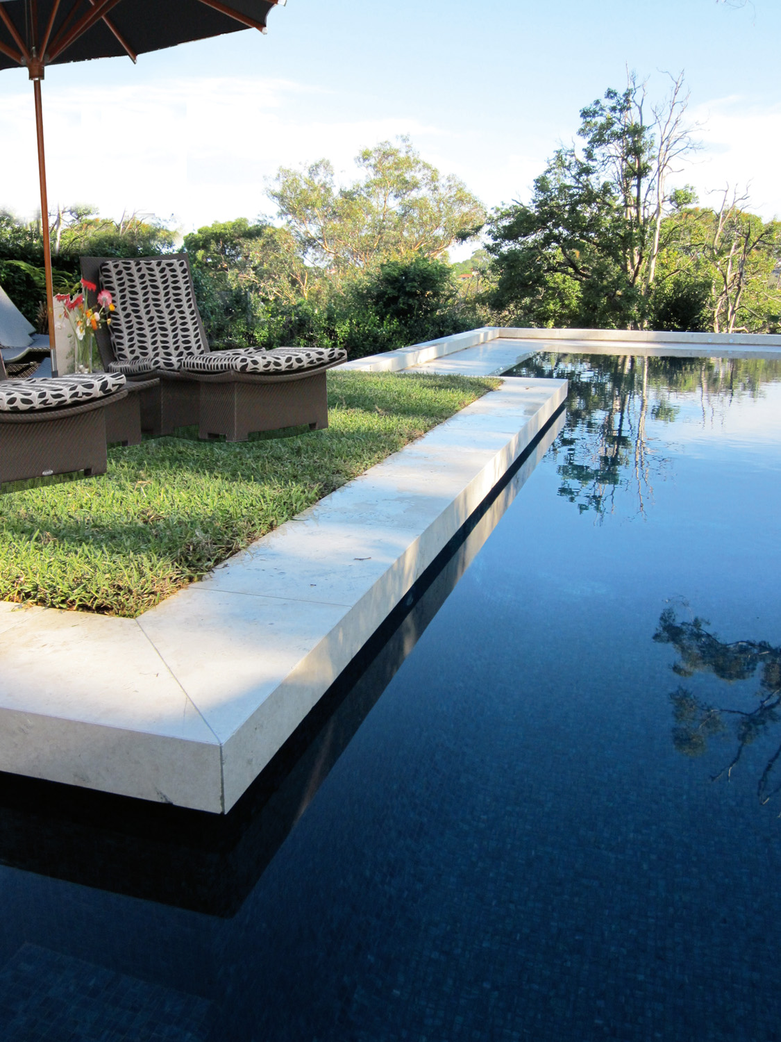 The pool was designed with deep, middle and shallow areas for diving safety and so older children could play pool games such as volleyball. The formal swimming pool has translucent deep blue glass tiles that make the water shimmer and sparkle.