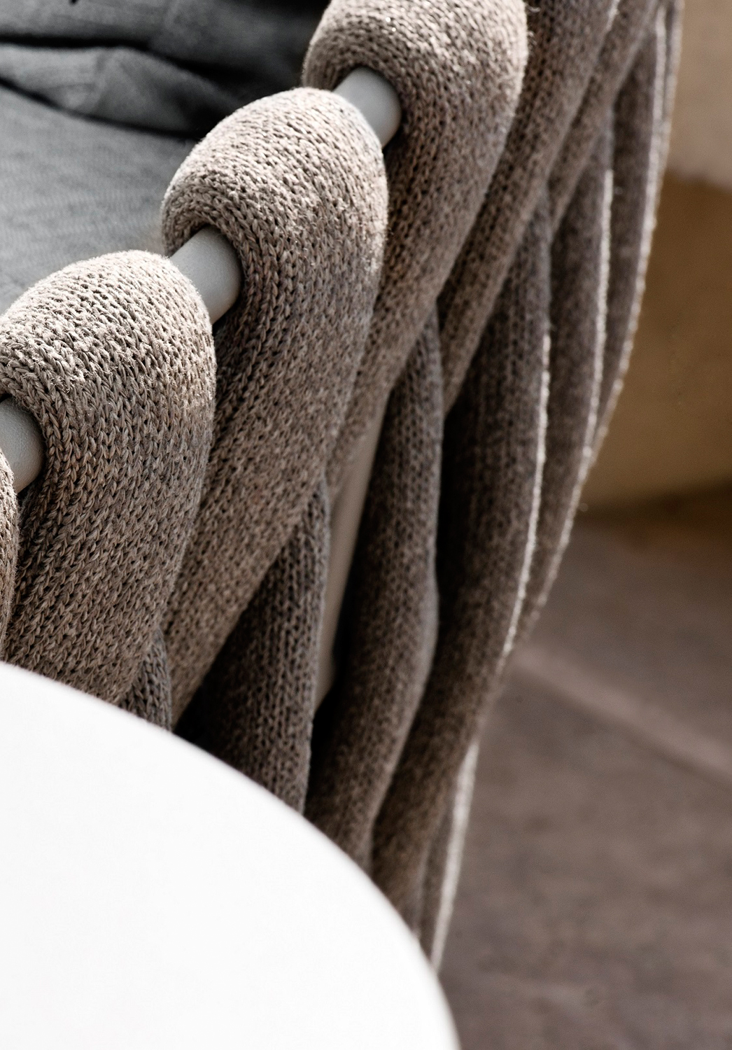 The material for the braiding is genuinely innovative; foam mousse is encased in a seamless sheath of knitted textilene and polyolefine which makes the material weather-resistant, but also surprisingly soft to the touch.