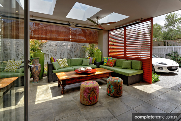 A small entry in the house leads to more light in the spectacular outdoor room. While this house was once small and dark, now louvre bifold doors and skylights marry the indoor and outdoor areas and wash the home in soft light. “The contrast of a small, dark entry moving into a grand, bright space is a continuous joy for the homeowner and a delight to guests,” says Toni.