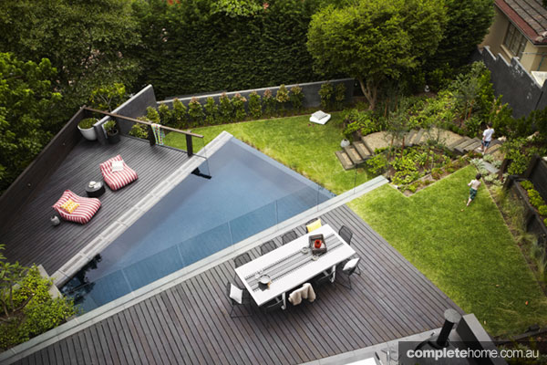 The fully tiled swimming pool is a key element in the fan shape and its irregular shape looks particularly impressive when viewed from the home’s upper-storey balconies. The same applies to the two decks. These were built using tallowwood, which was stained a darker colour to link to the exterior colour of the house. This also marries with the dark-stained cedar screen along the side of the far deck.