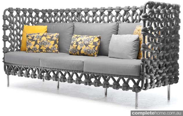 The Cabaret sofa by Kenneth Cobonpue fuses traditional craft techniques with elegant modern aesthetics. The detailed fabric webbing is most striking and forms the support for the cushions. Stretched over a steel frame, this lattice almost evokes a modern hammock and contributes an effortless lightness to the pieces. Available from KEZU. kezu.com.au