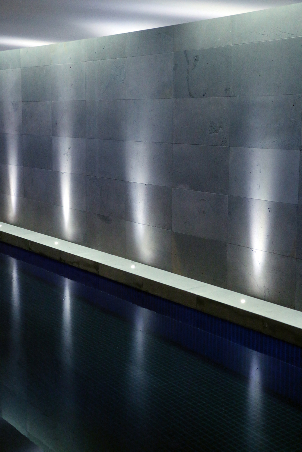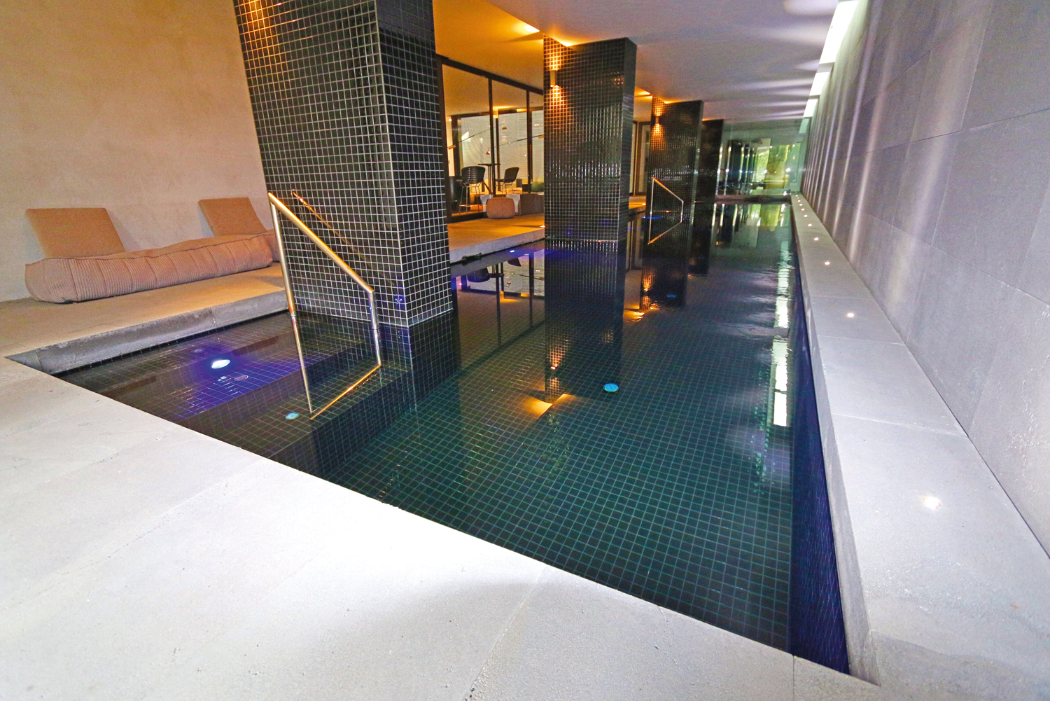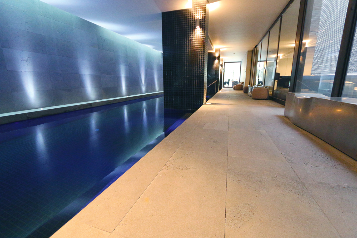 Underfloor heating was installed beneath the bluestone flooring. An unexpected, but delightful consequence of this was that the stone insulated the home evenly and efficiently. Outside, a feature wall creates a spectacular backdrop for the pool area. Backlighting highlights the stone’s innate features, creating a natural and elegant space.