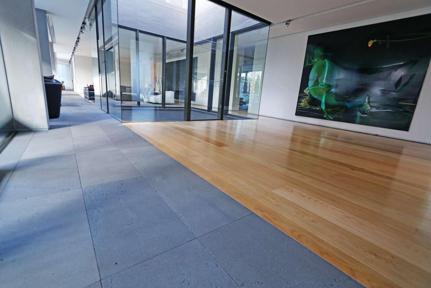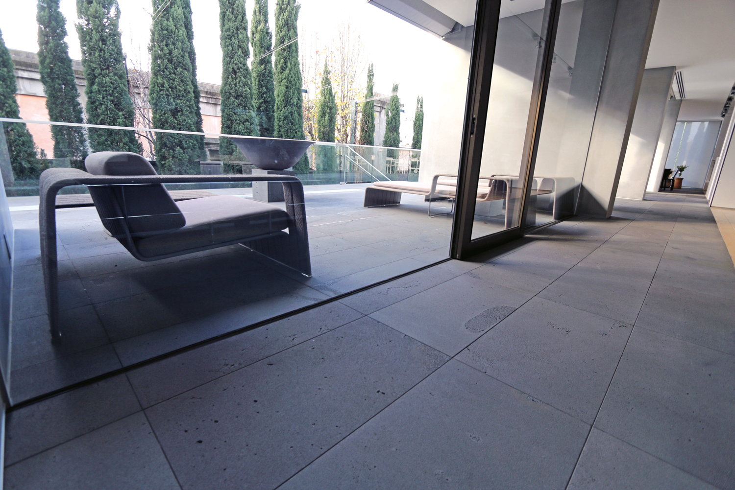 Select-grade Bamstone bluestone was used for both the interiors and exteriors of this development. Inside the home, the rawness of honed natural stone contrasts beautifully with the honeyed warmth of the timber flooring. The stone flows seamlessly from the interior to the exterior, helping to soften the lines between the natural and built spaces within the property.