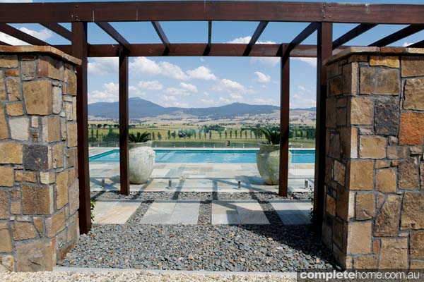 The interior of the pool is fully tiled with 20 millimetre glass mosaics, guaranteeing that it glimmers night and day. Naughtons Pools and Spas also included an in-built seat so that the owners can sit in the pool with a glass of wine and relax while taking in the beautiful surroundings. Near-invisible frameless glass fencing ensures that these views are unimpeded while natural stone paving frames the pool area, perfectly complementing the blue of the water and the rural environment.