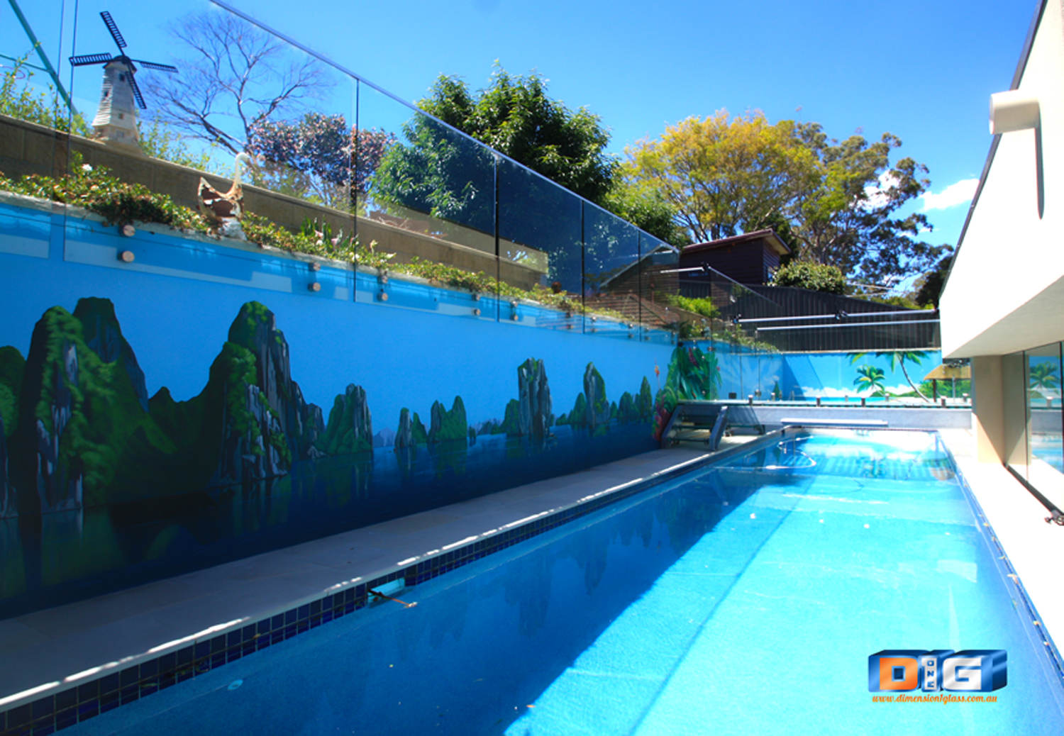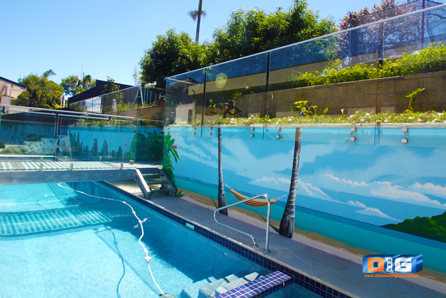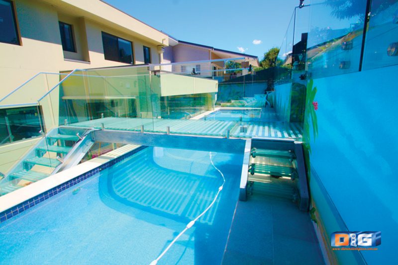 The owners wanted to make use of the rear of their property. We were called in to see if we could help with the challenge. Prior to this we have installed glass floors into pools and pool windows but we have never installed a glass bridge. For this exciting new project we used hot dipped galvanized steel channel that was constructed over the concrete shell (all prior to the tiling). We then had to measure the glass and install 38mm lamination glass with sandblasted non slip lines in the glass for the walkways. The owner painted the surrounding walls with a mural to soften the retaining walls.